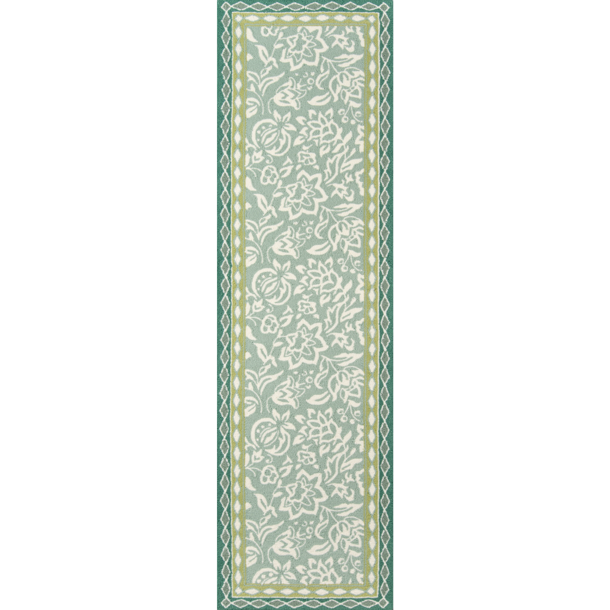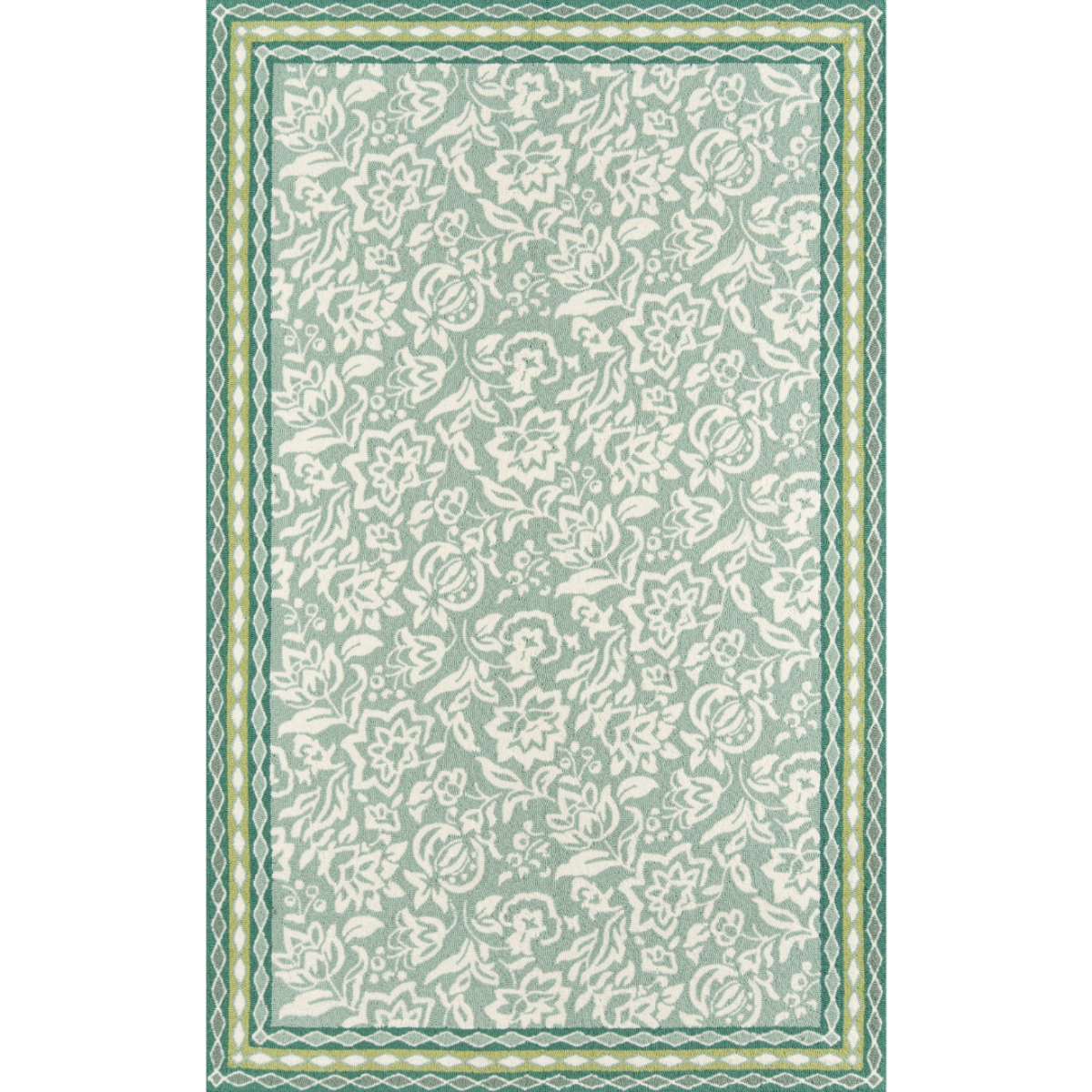 A touch of the exotic comes to life with the timeless, low-maintenance good looks of the Hampton Court wool rug in blue and green . Think bohemian Indian block-print-style glorious lotus blossoms and pomegranates wrapped within a bold graphic border. Timeless. Fresh. Inviting. Terrific for any space that demands a lot of “look” paired with function, this low-maintenance rug is made from hard-wearing wool. Perfect for a covered patio, porch, or any room with high-traffic demands. Pet- and kid-friendly.