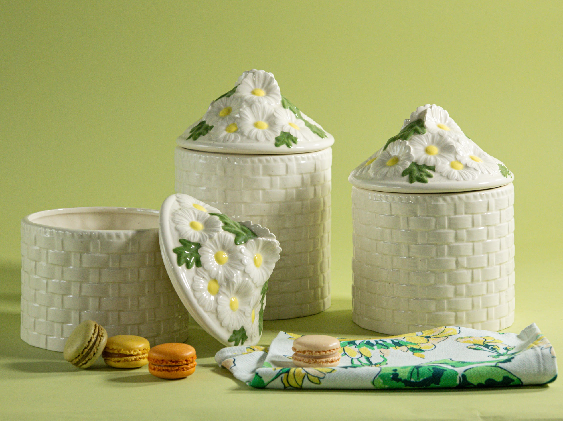 Vintage White Porcelain Basketweave and Daisy Canisters, Set of 3