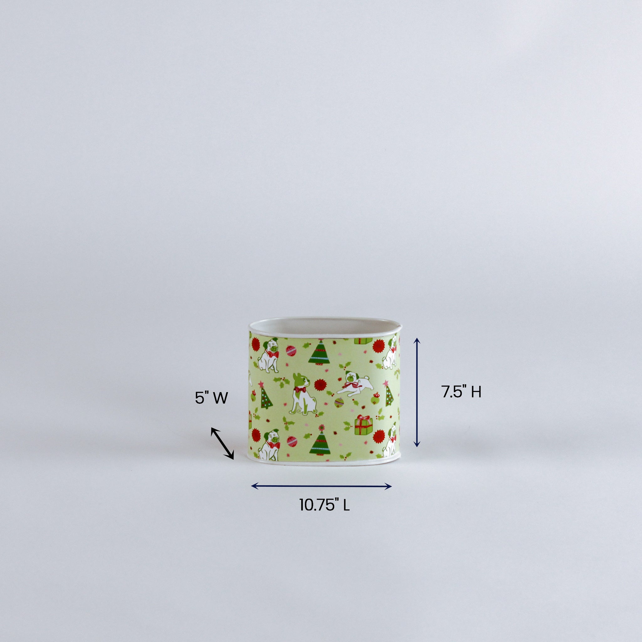 Turn to a marvelous Madcap Cottage decoupage caddy to store your various sundries on your desk, kitchen counter, foyer table and more. Gorgeously embellished with one of Madcaps original patterns, Pug Perfection features sweet pugs and boston terrier pups surrounded by Christmas motifs. The Pug Perfection Christmas caddies also make for a perfect container for your holiday gifts. A Madcap Cottage exclusive. As this product is made to order, it is not eligible for returns.