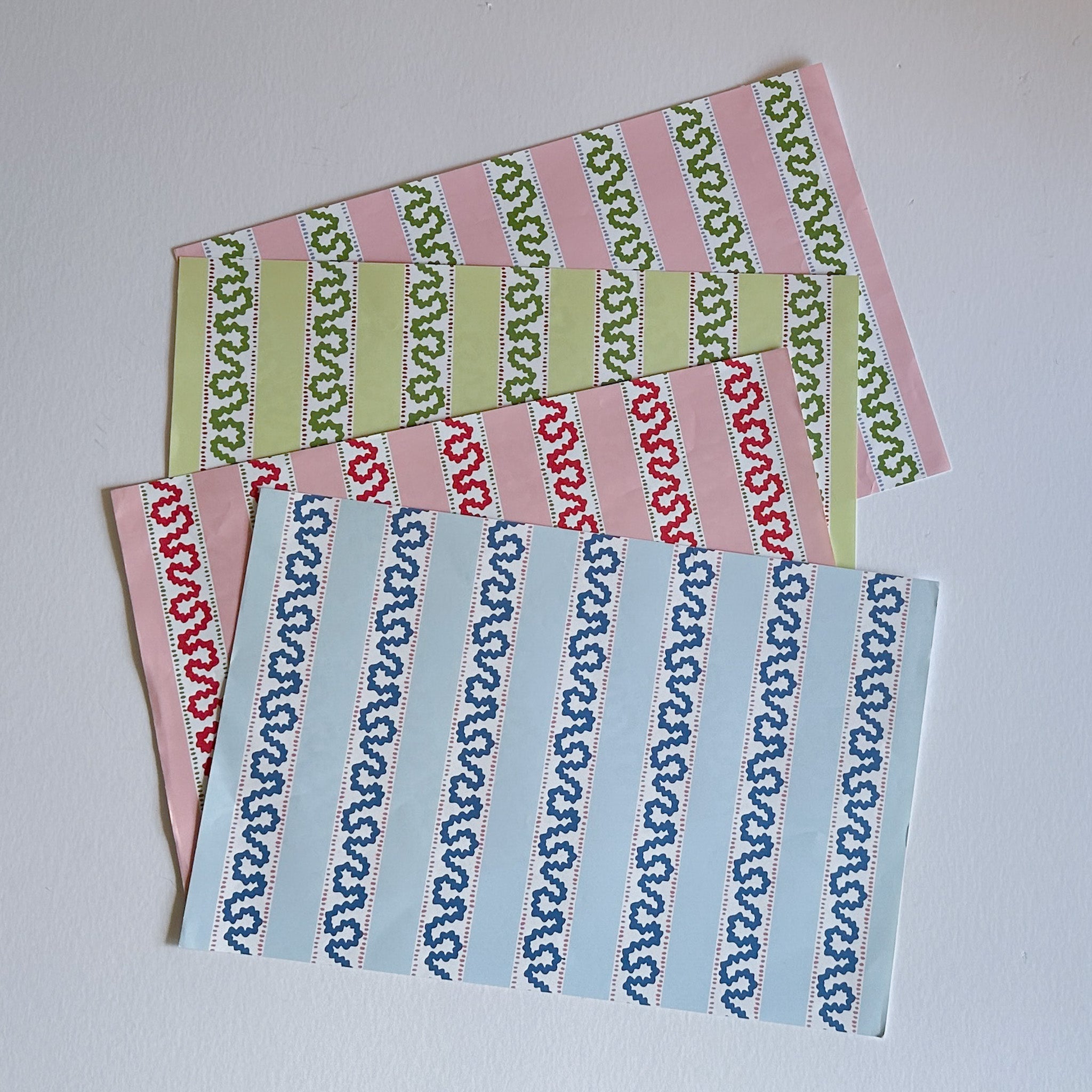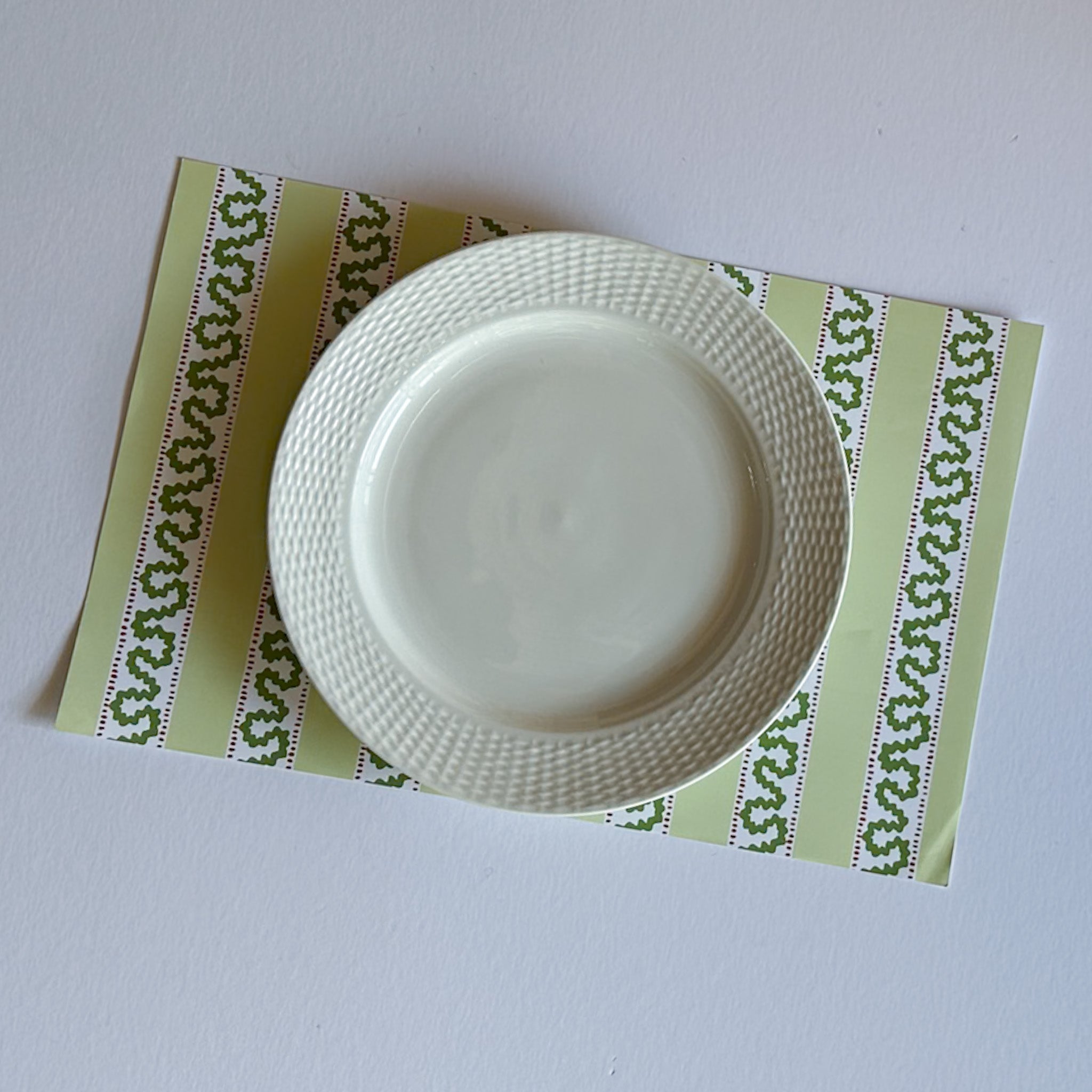 Harbor Trail will whisk you off to the easy-breezy climes of Palm Beach where the living is easy and the sun shines down upon a timeless wonderland. Say the Madcaps, "I sketched this pattern one afternoon while lunching at our favorite Renato's restaurant in Via Mizner with fountains tinkling in the background. I hope these made-in-America paper placemats deliver that spirit of a magical afternoon spent under the swaying palm trees." Green in color.