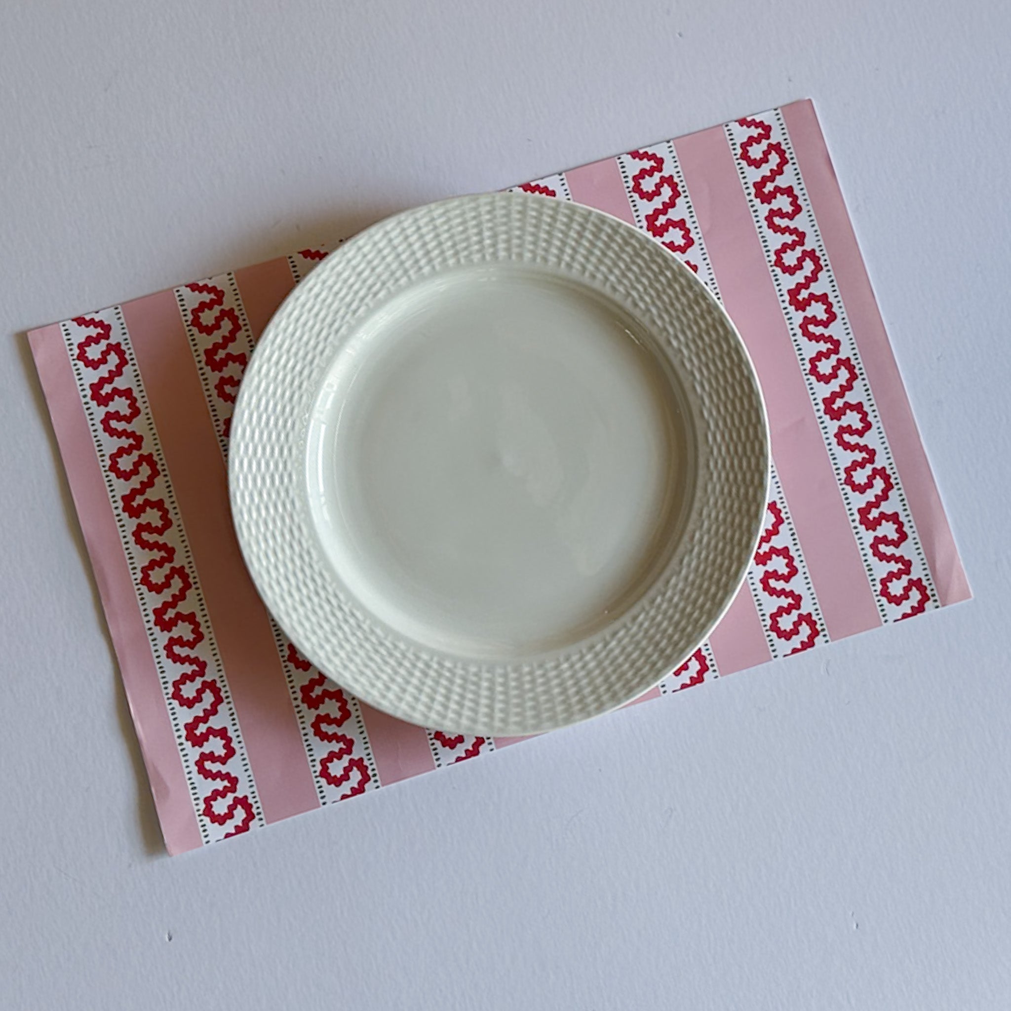 Harbor Trail will whisk you off to the easy-breezy climes of Palm Beach where the living is easy and the sun shines down upon a timeless wonderland. Say the Madcaps, "I sketched this pattern one afternoon while lunching at our favorite Renato's restaurant in Via Mizner with fountains tinkling in the background. I hope these made-in-America paper placemats deliver that spirit of a magical afternoon spent under the swaying palm trees." Pink/Red in color.