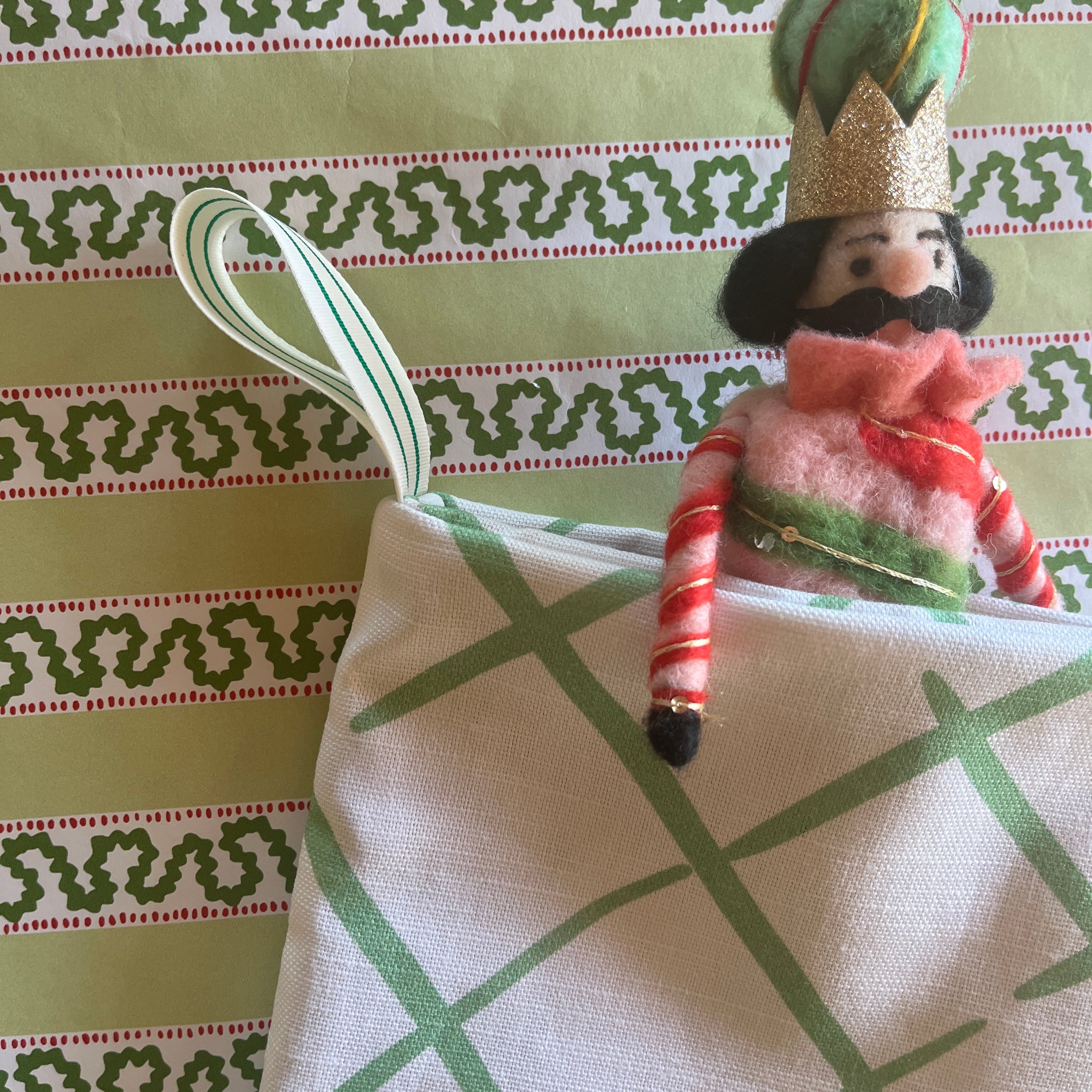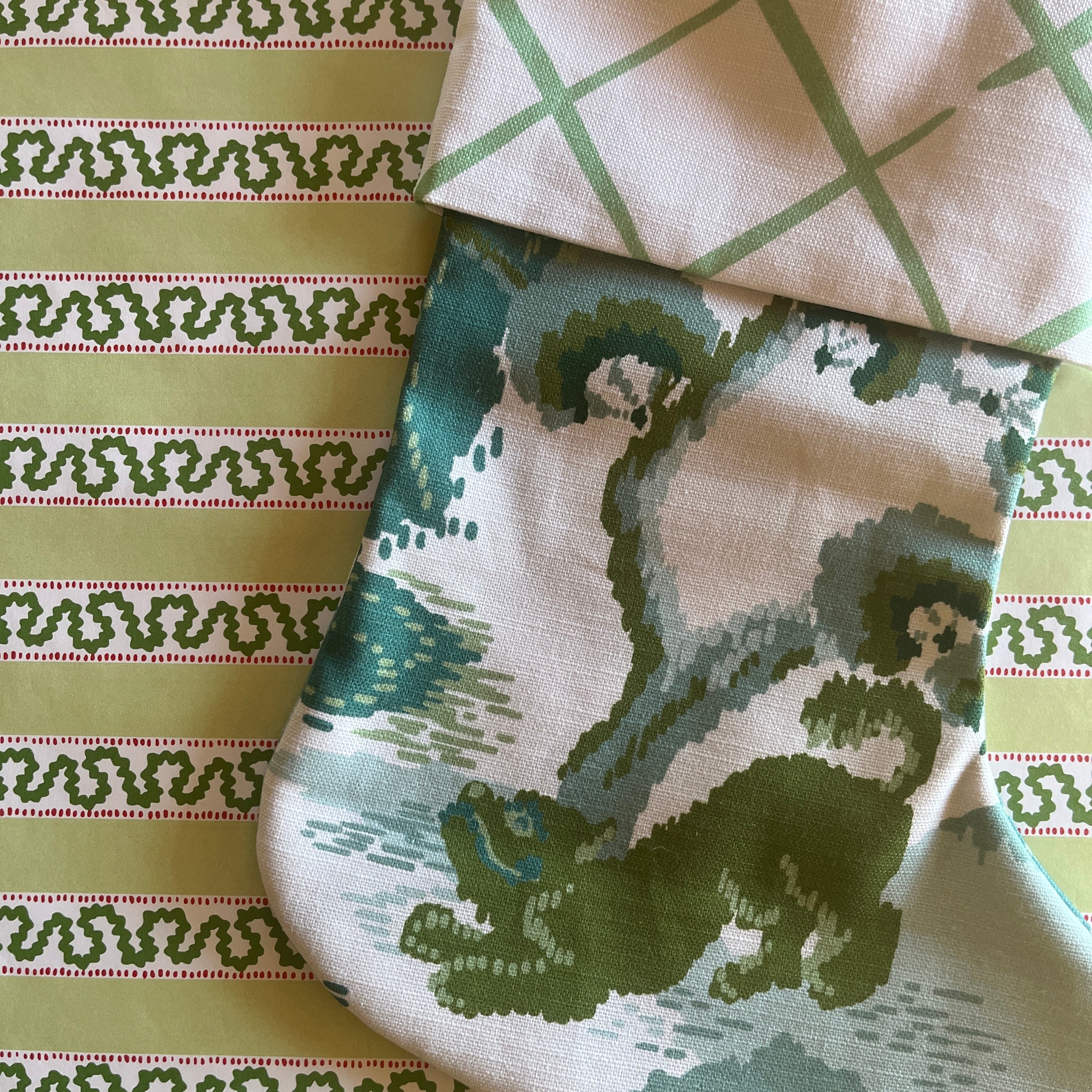 This timeless, Old Peking Celadon Green Christmas Stocking mixes two stunning Madcap Cottage fabric patterns--Old Peking and Bahama Court Reverse--to create a wonderful, heirloom-worthy Christmas treasure. The mix of patterns come together with a vibrant spark. Your fireplace mantel never looked so good. Or so chic!