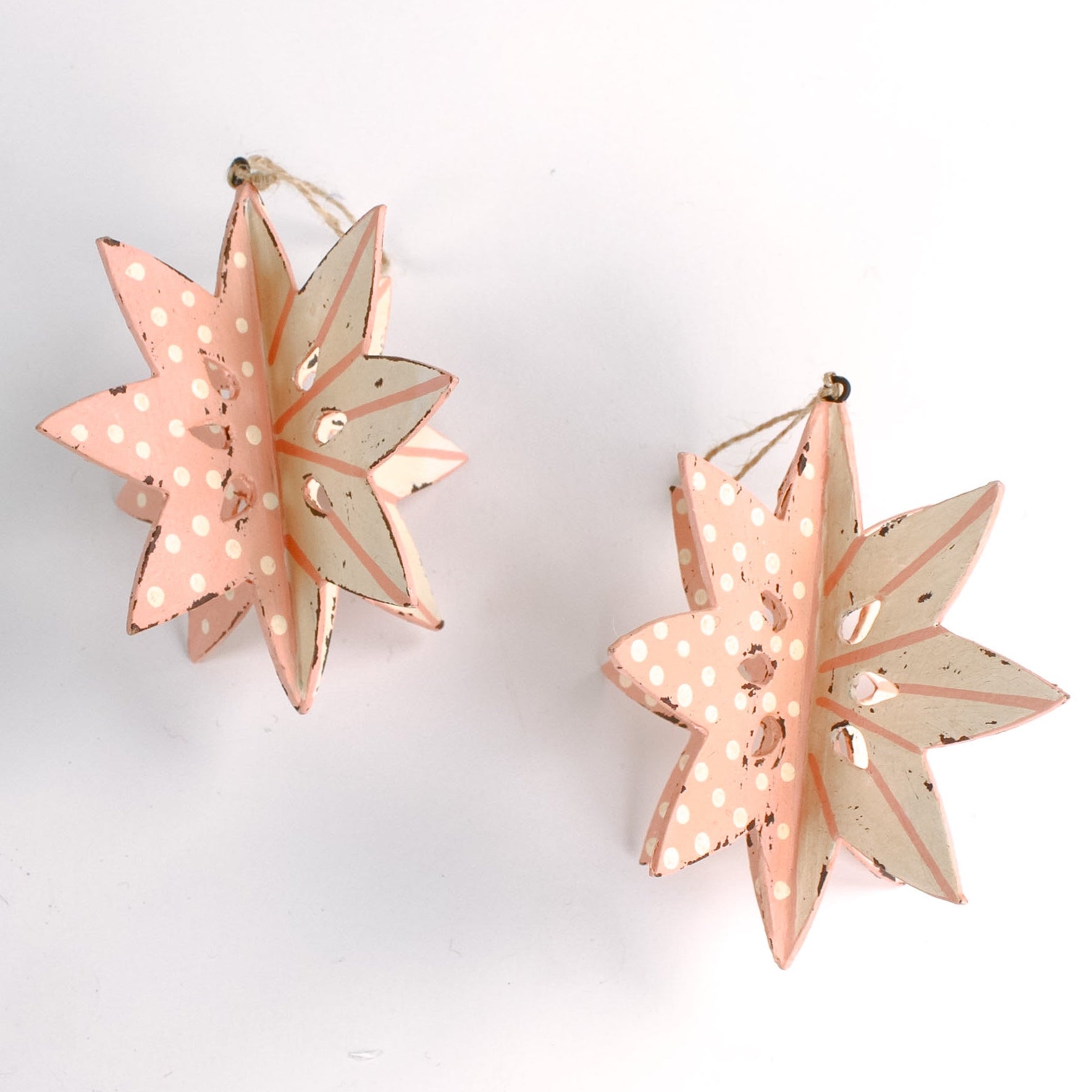 set of two large wooden star christmas ornaments painted in pink and white with distressed polka dot details