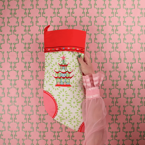 Deliciously embellished with a star-capped pagoda and delightful embroidered motifs (look close to savor the exceptional detailing!), this classic, chinoiserie-chic green Christmas stocking will leave you dreaming of far-flung adventures. A new classic.