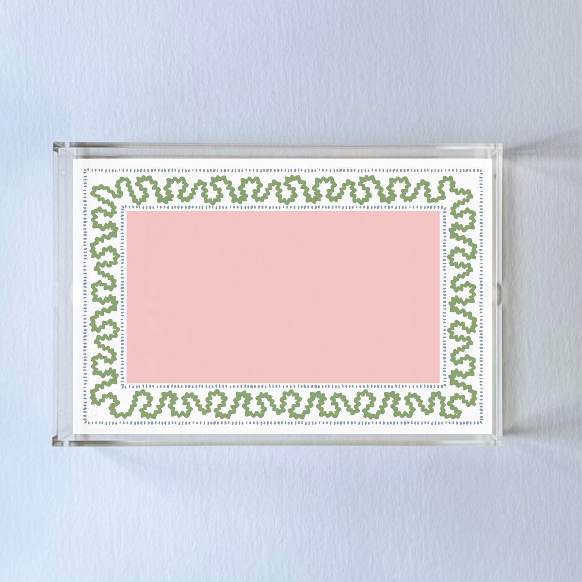 Madcap Cottage brings a whimsical, timeless pattern with Harbor Trail that features a field of shell pink with a festive green and blue border. Harbor Trail acrylic rectangular trays come in two sizes and feature integrated handles. The smaller makes for a perfect petite tray; use the larger for serving tea or snacks. A Madcap Cottage exclusive. Also available are our coordinating Harbor Trail square acrylic trays!