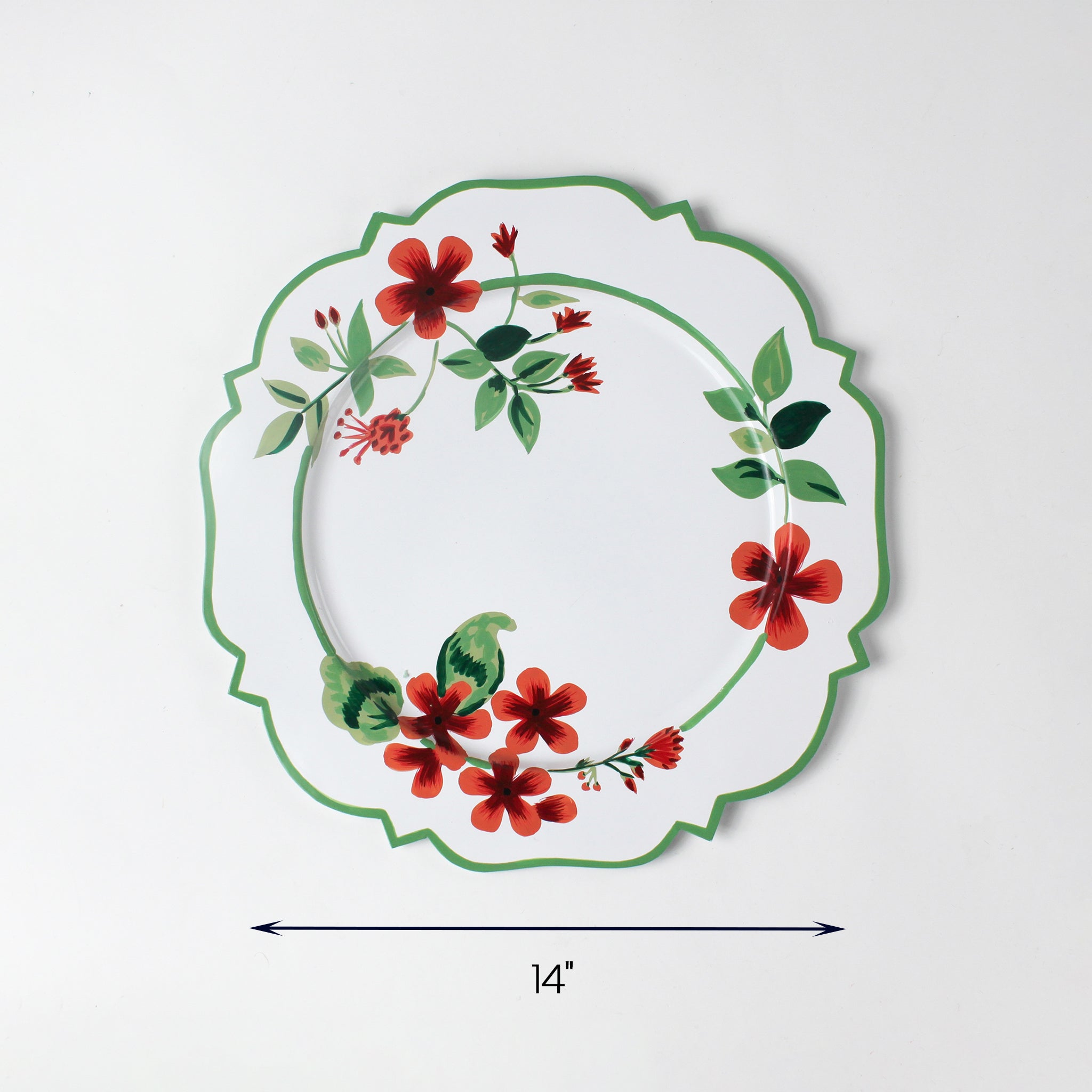Hand-painted in India based upon Madcap's original designs, these Cottage Grove geranium tole-metal hand-painted chargers are emblazoned with our red, green and white geranium pattern and will take your holiday table from nice to knockout.