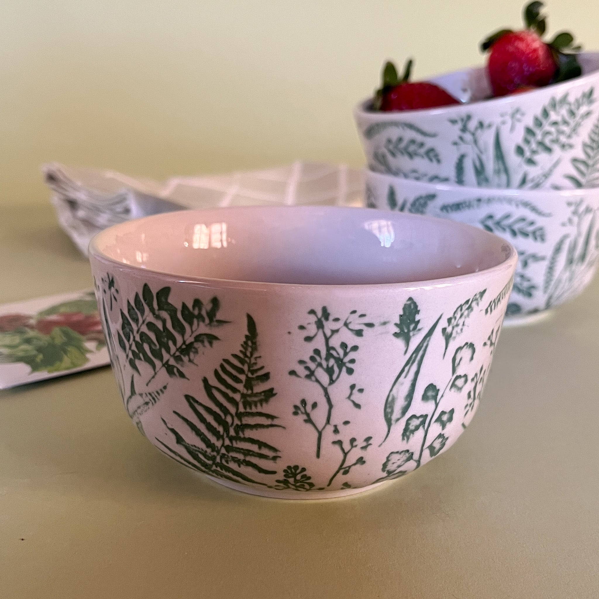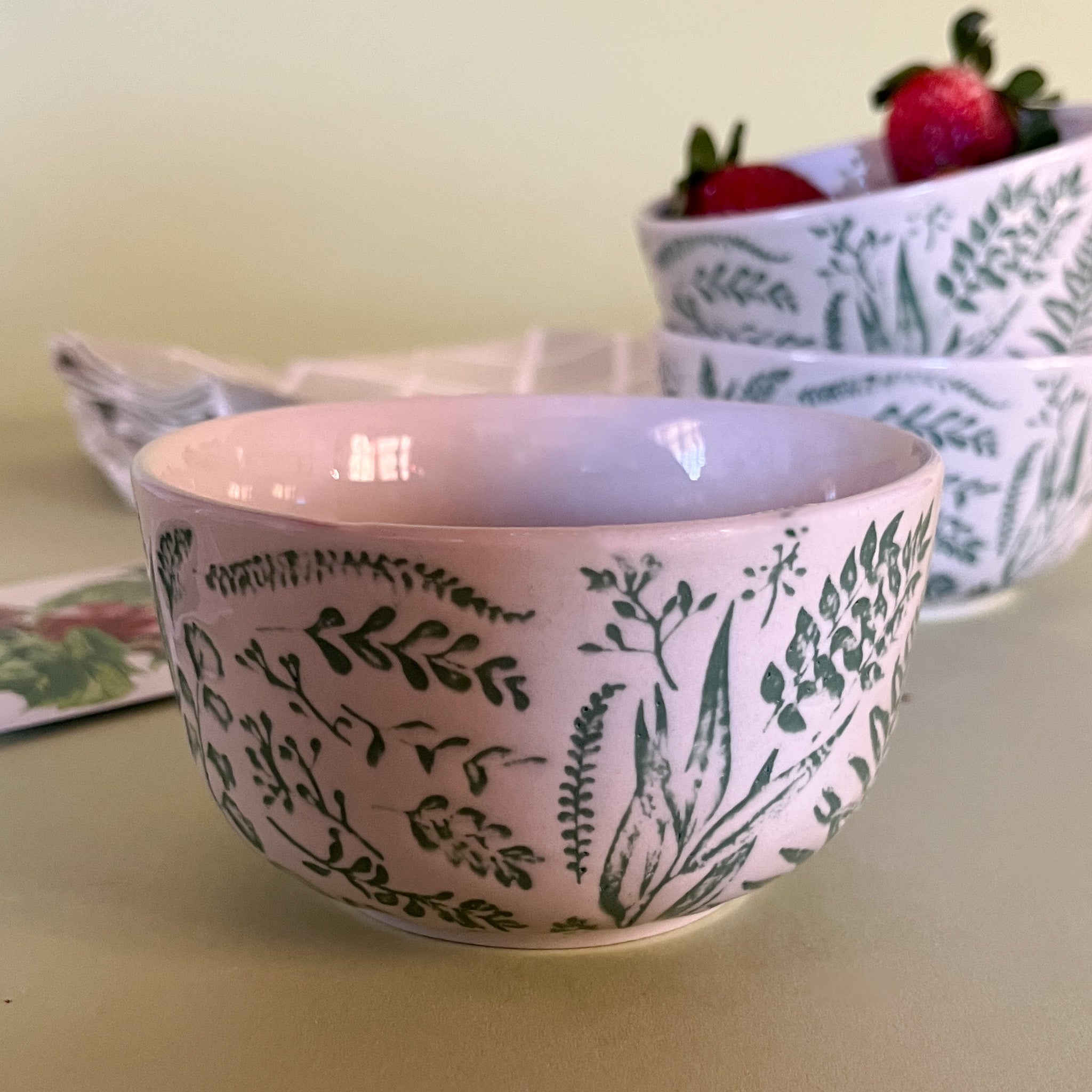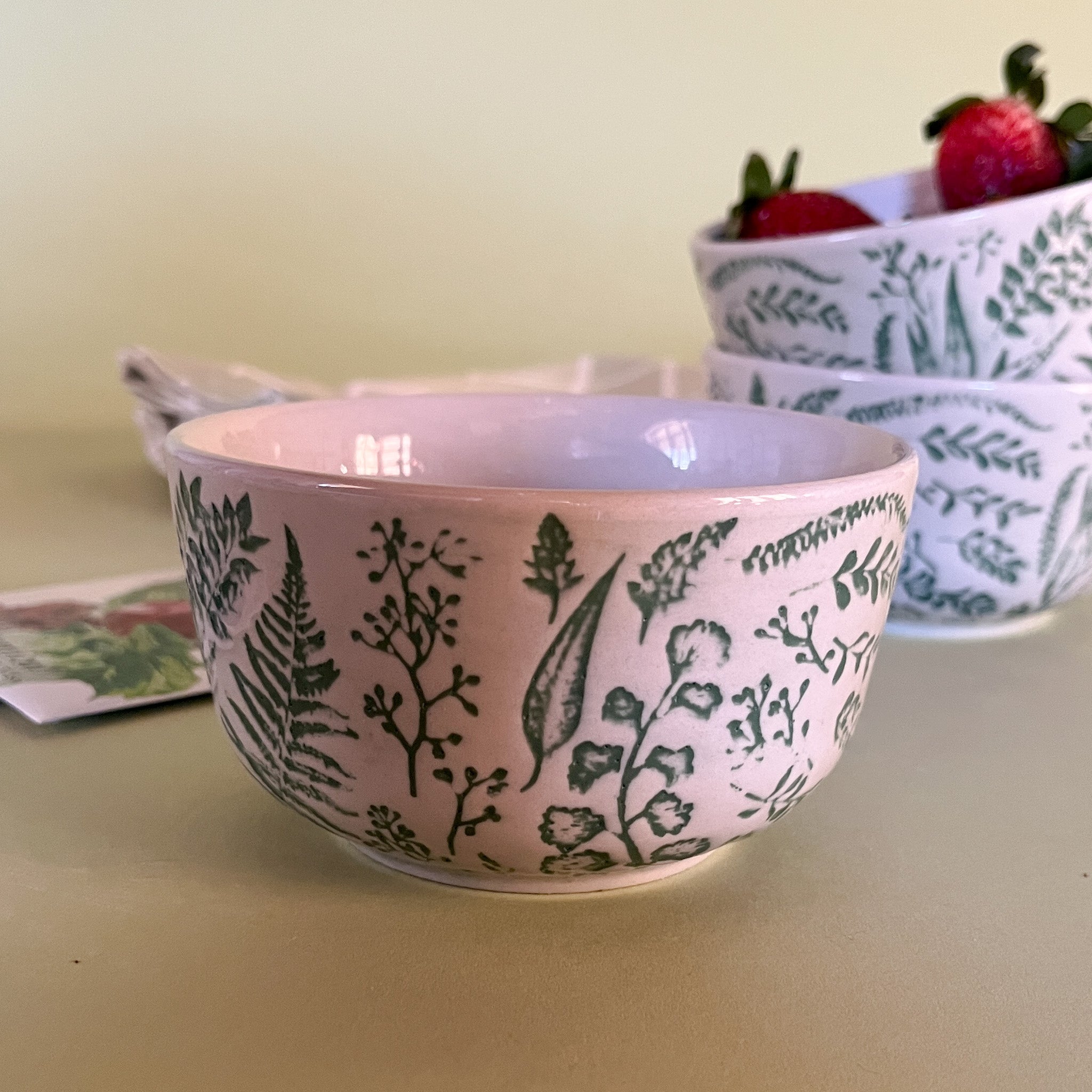 Hand-Stamped white and greenBotanic Bowls with strawberries