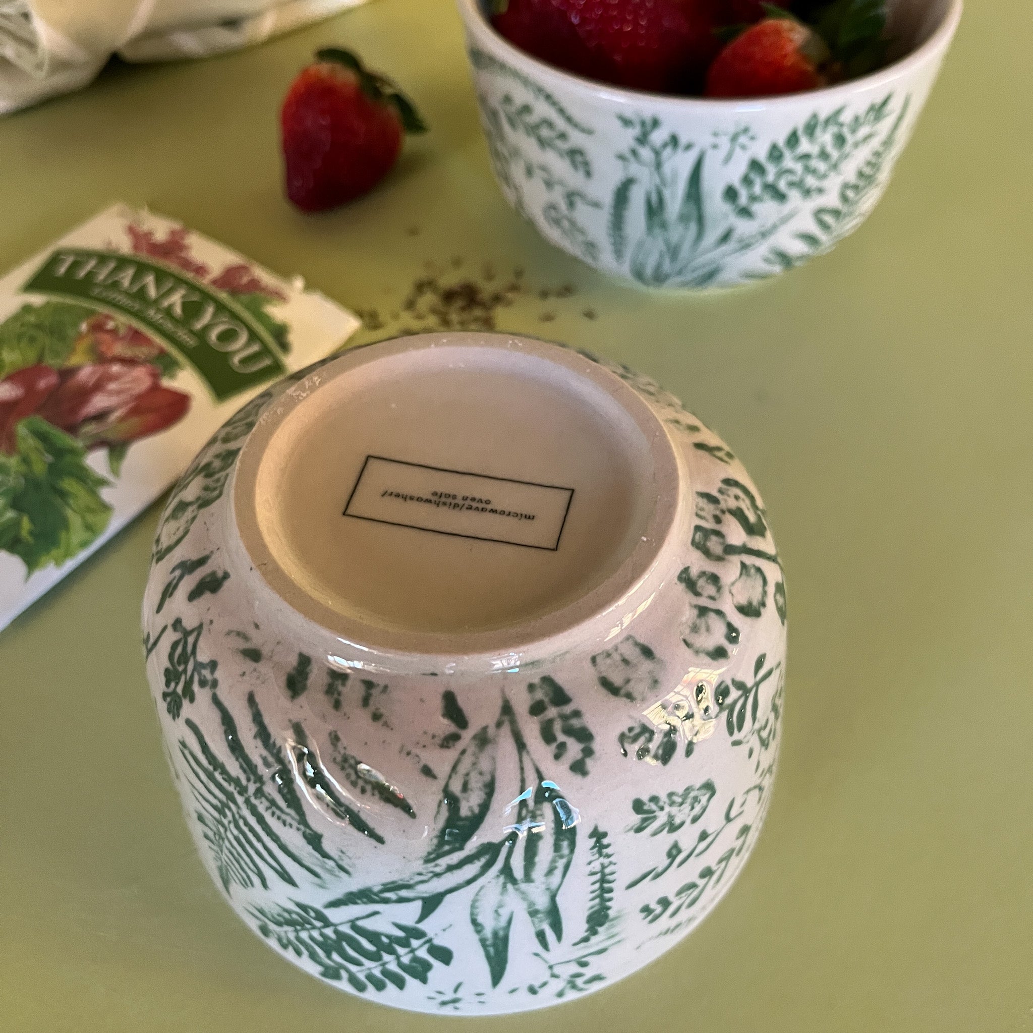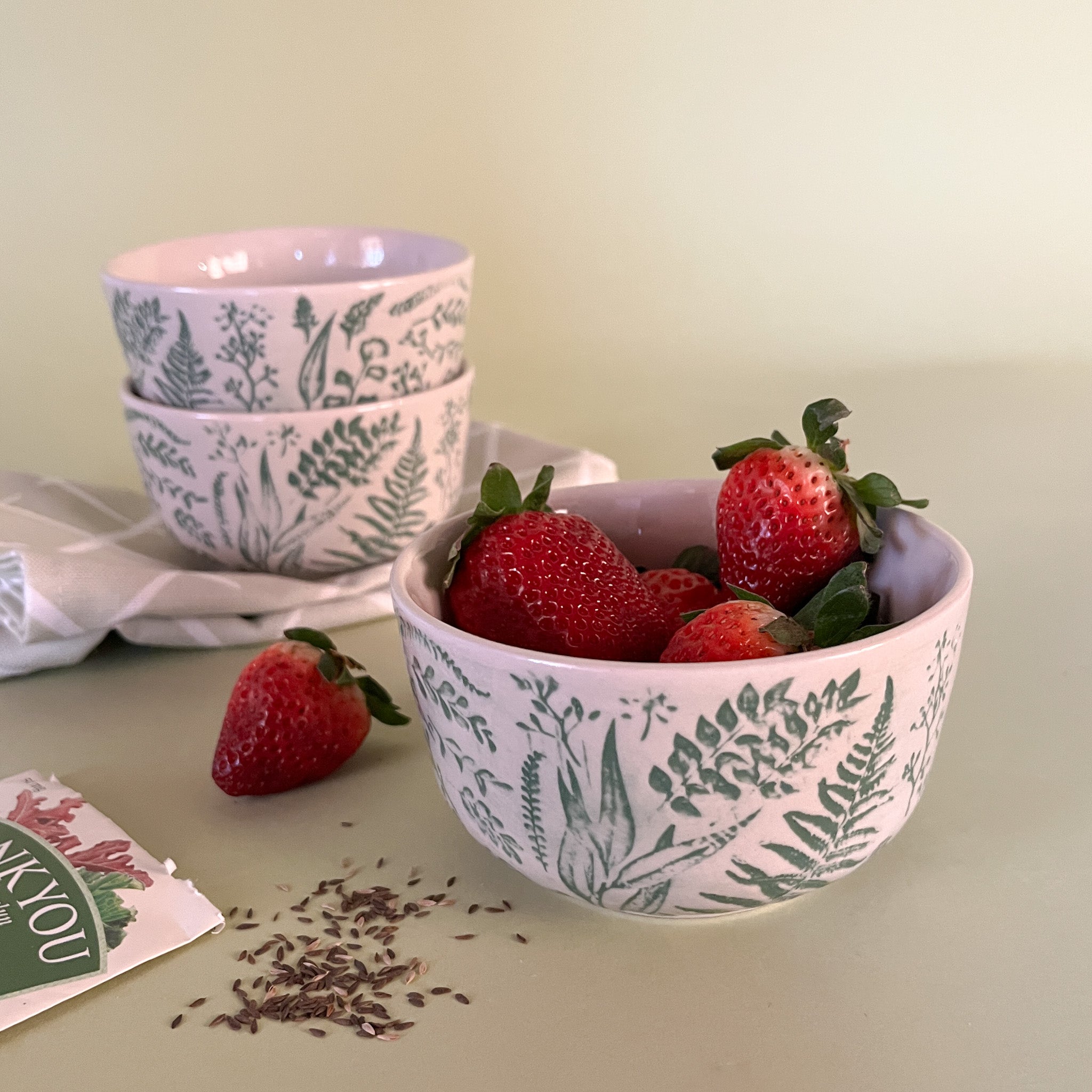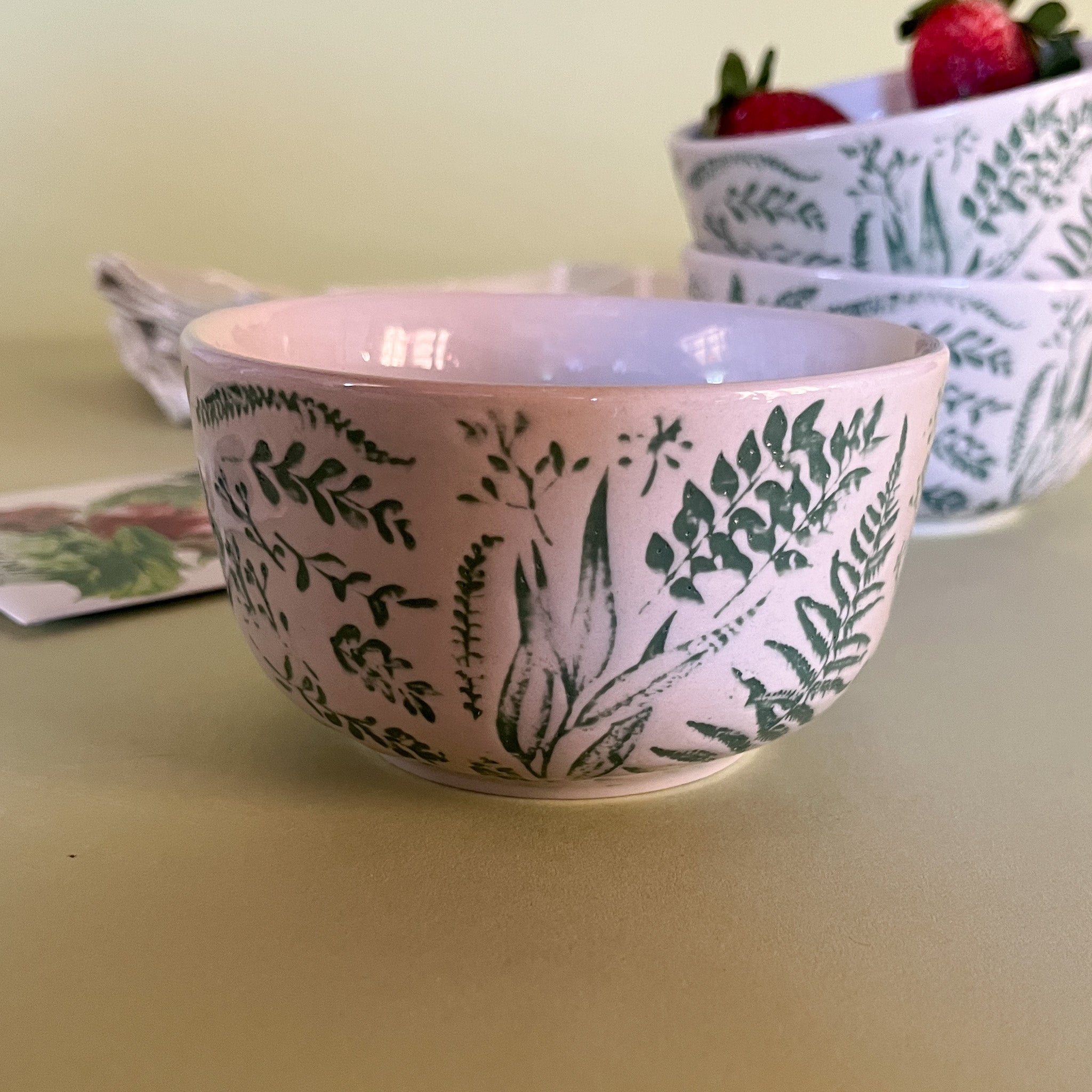 Hand-Stamped white and greenBotanic Bowls with strawberries