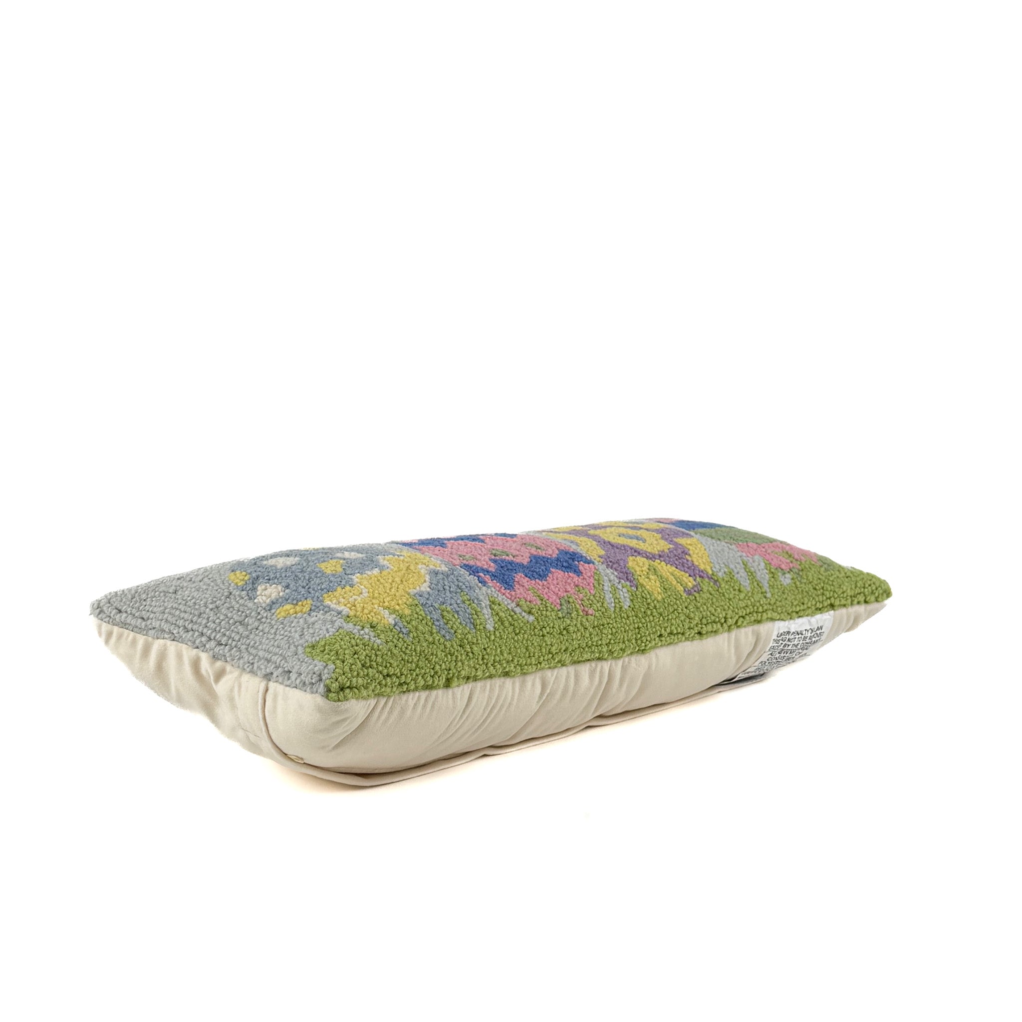 rectangular hooked pillow with colorful Easter eggs and grass design
