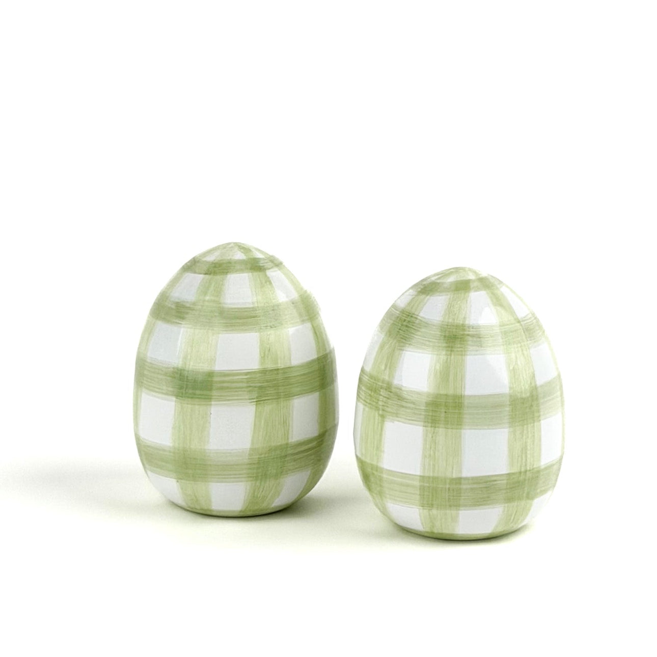 a pair of green gingham decorative Easter eggs on white background
