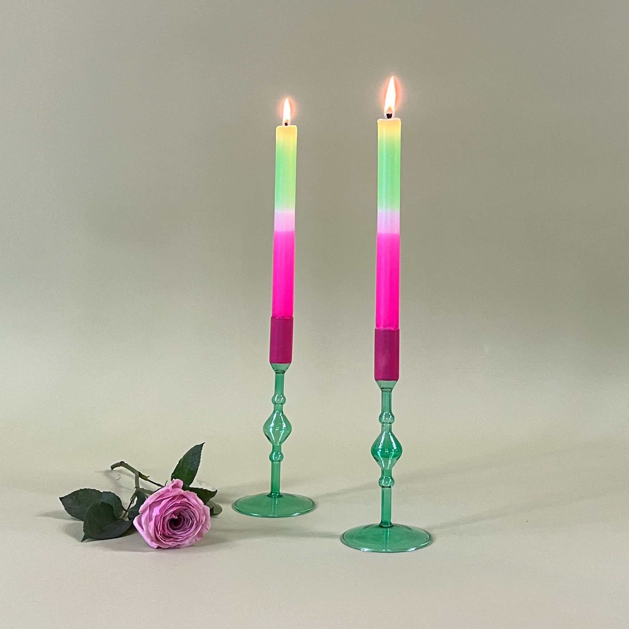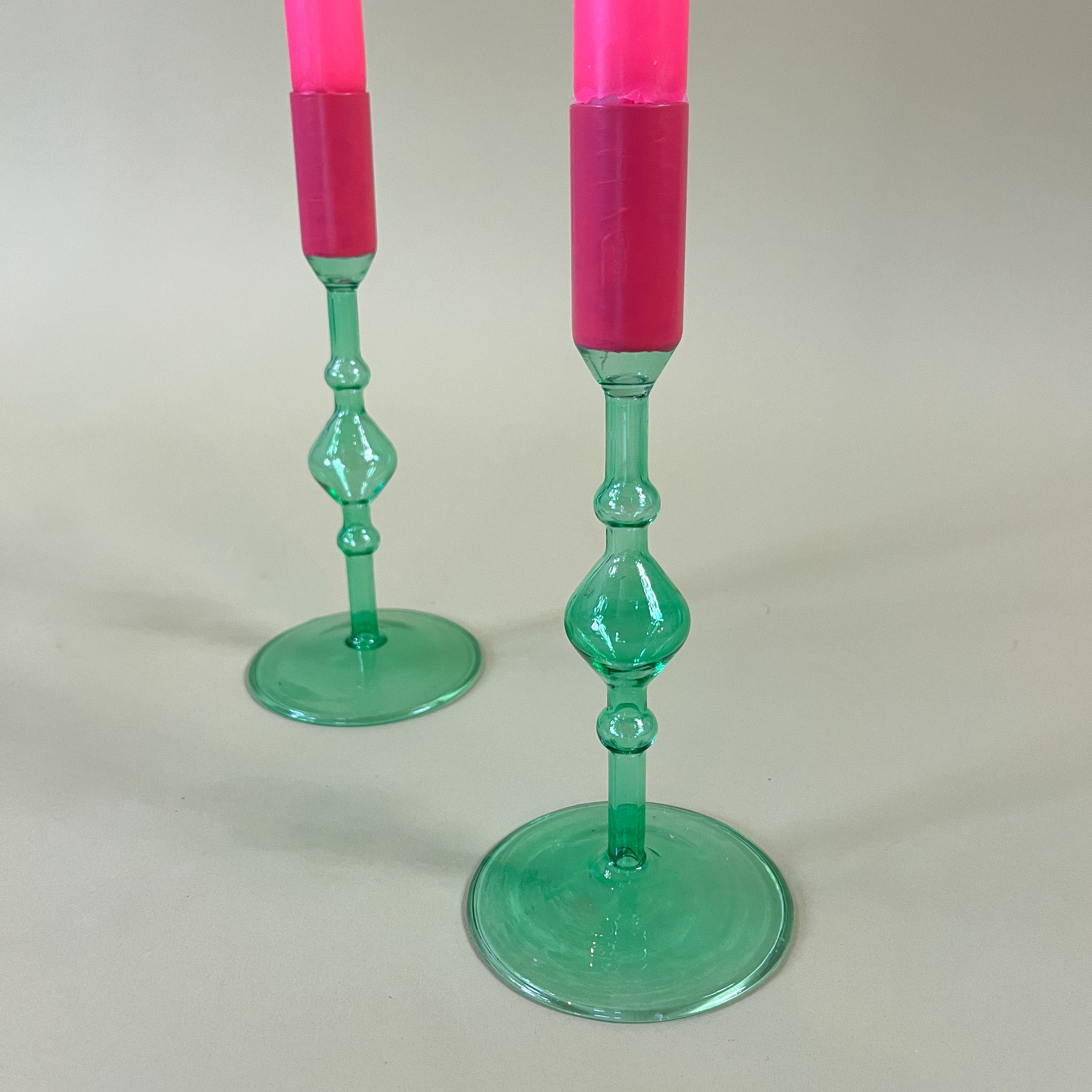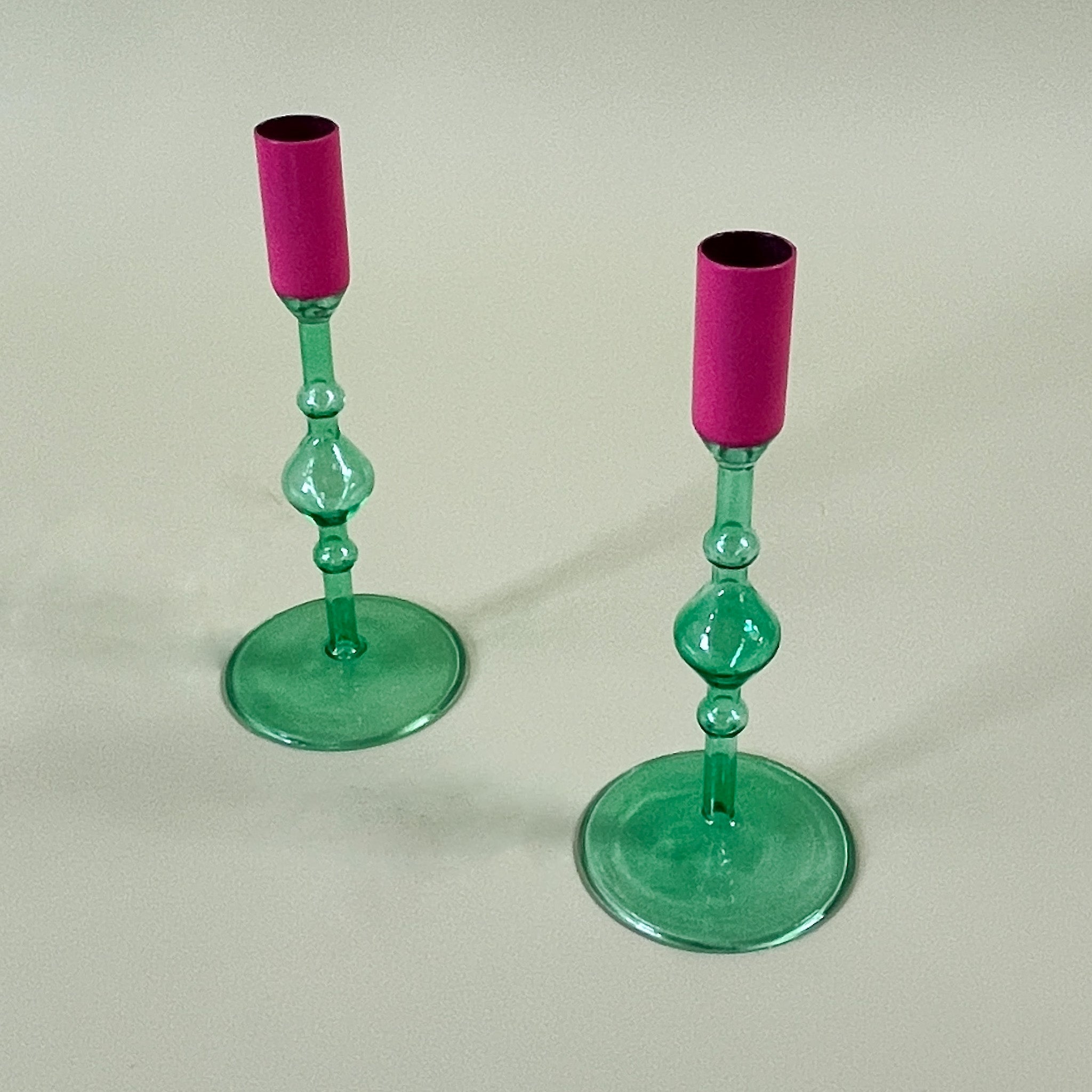 These stunning green glass candleholders with dramatic painted tops deliver just the right pop of color for a festive table. Absolute stunners! And they make for a wonderful gift, too.