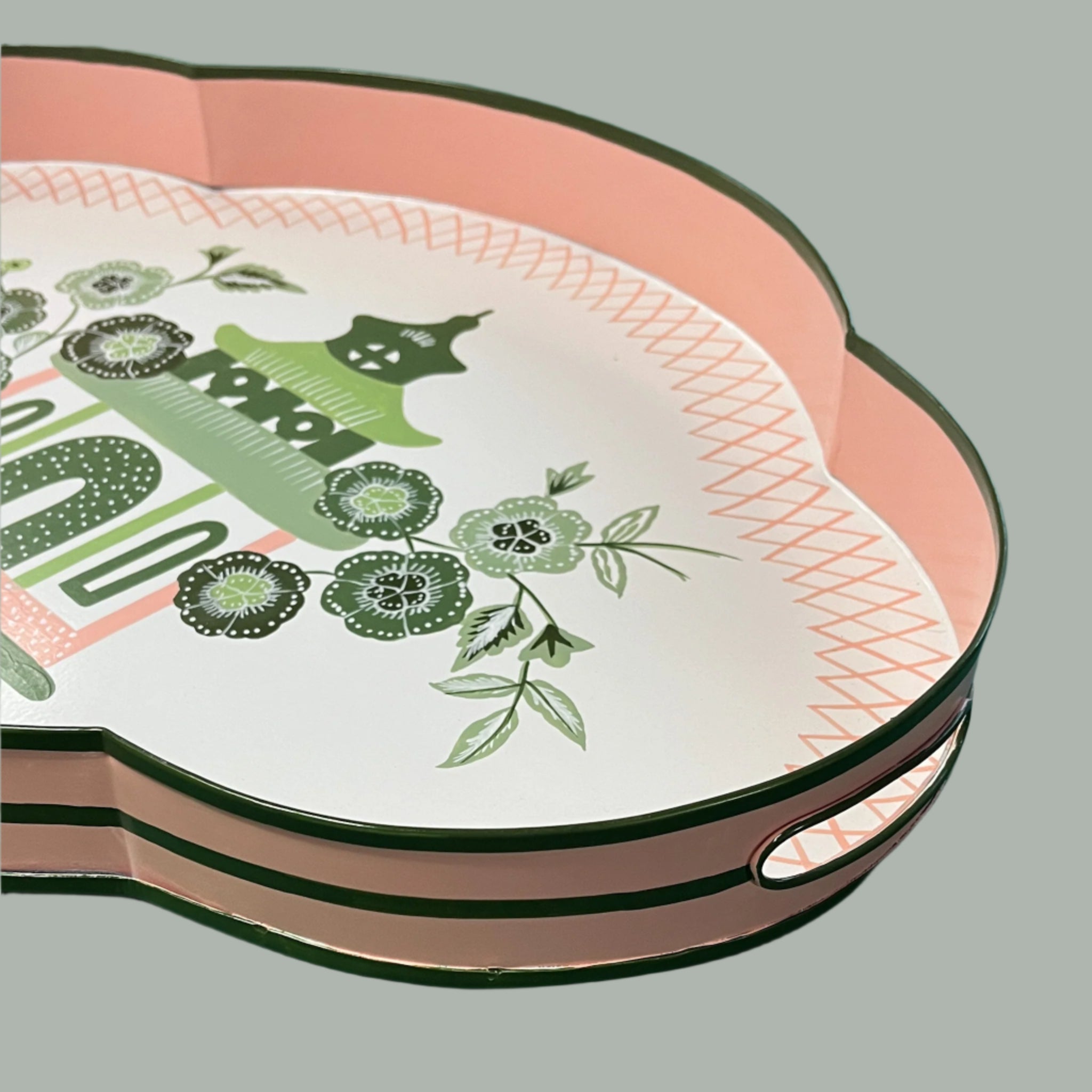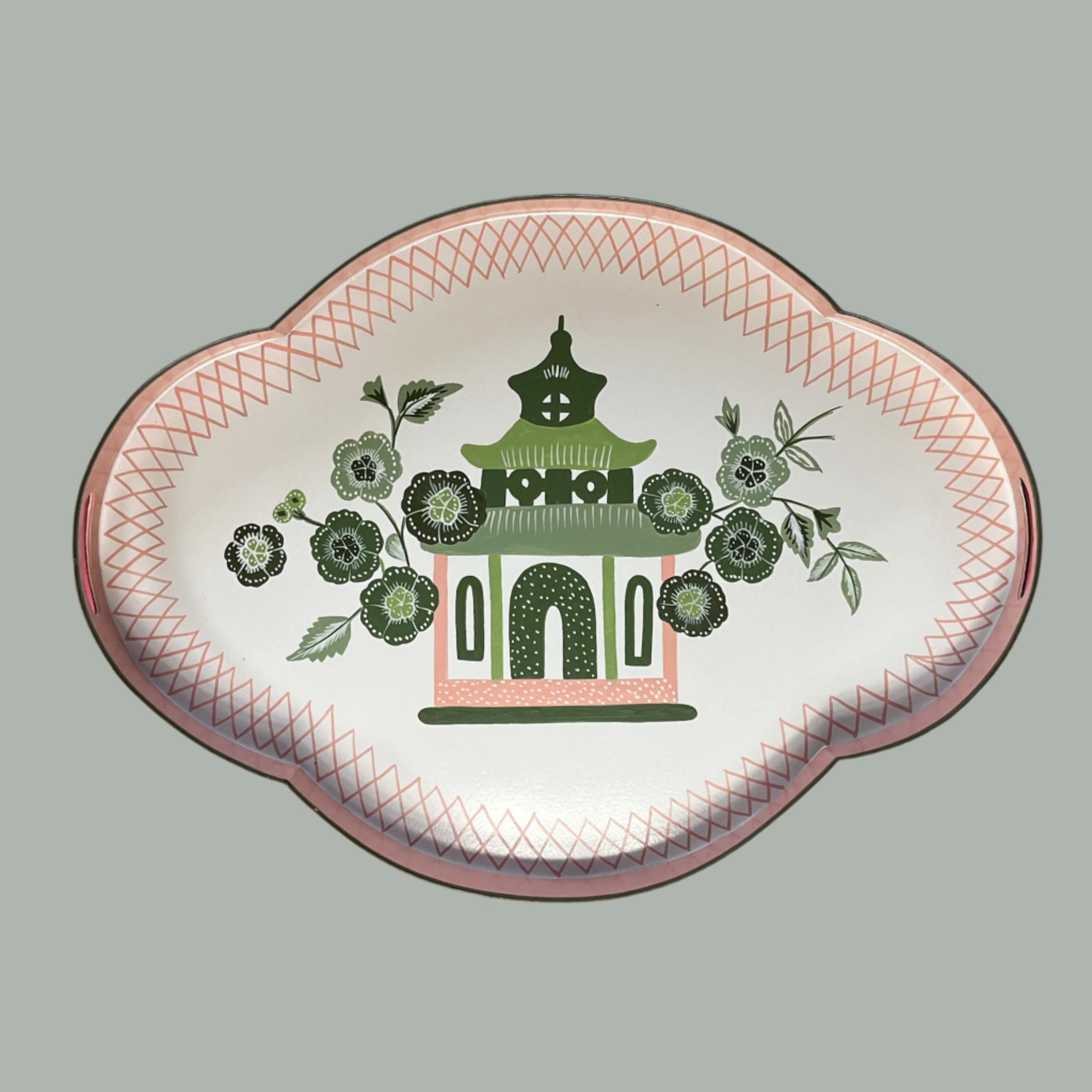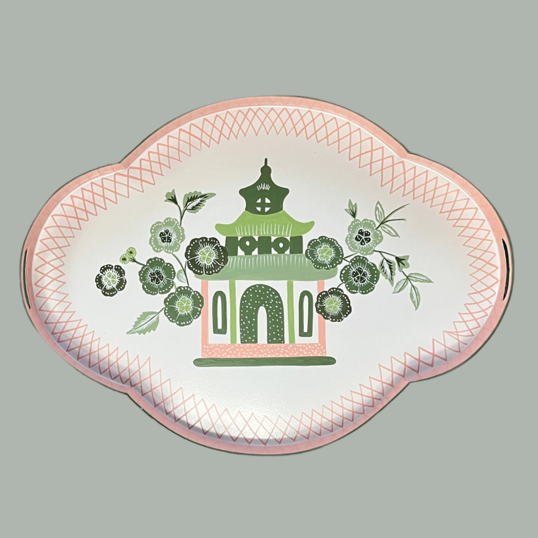 Hand-painted in India to the Madcaps designs and specifications, this amazing quatrefoil tole metal tray with beautiful pagoda and blossom motifs in pink and green boasts integrated handles and is the perfect bar accessory. Hello, martinis! A true work of art. And the perfect gift!