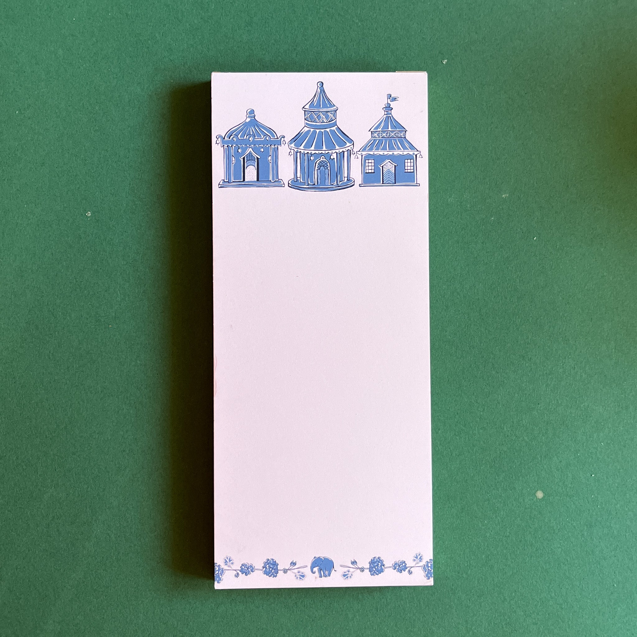 Pagodas Skinny Notepad in blue featuring illustrated pagoda designs and floral border in a green background