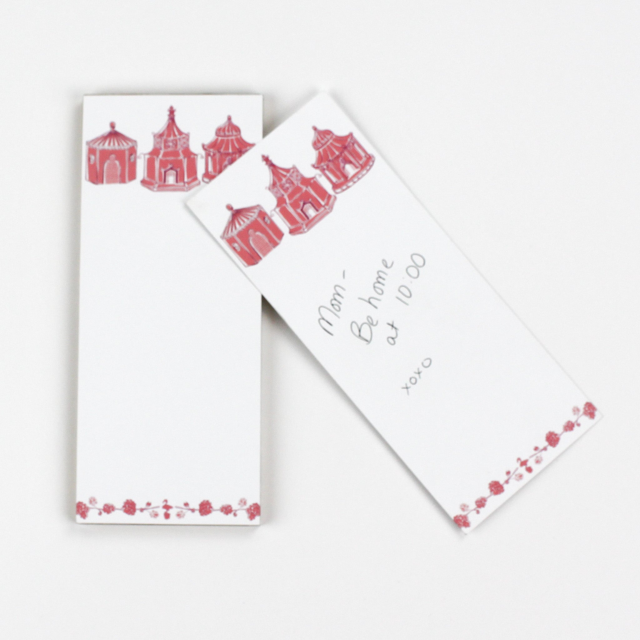 Pagodas Skinny Notepad in pink featuring illustrated pagoda designs and floral border in a white background