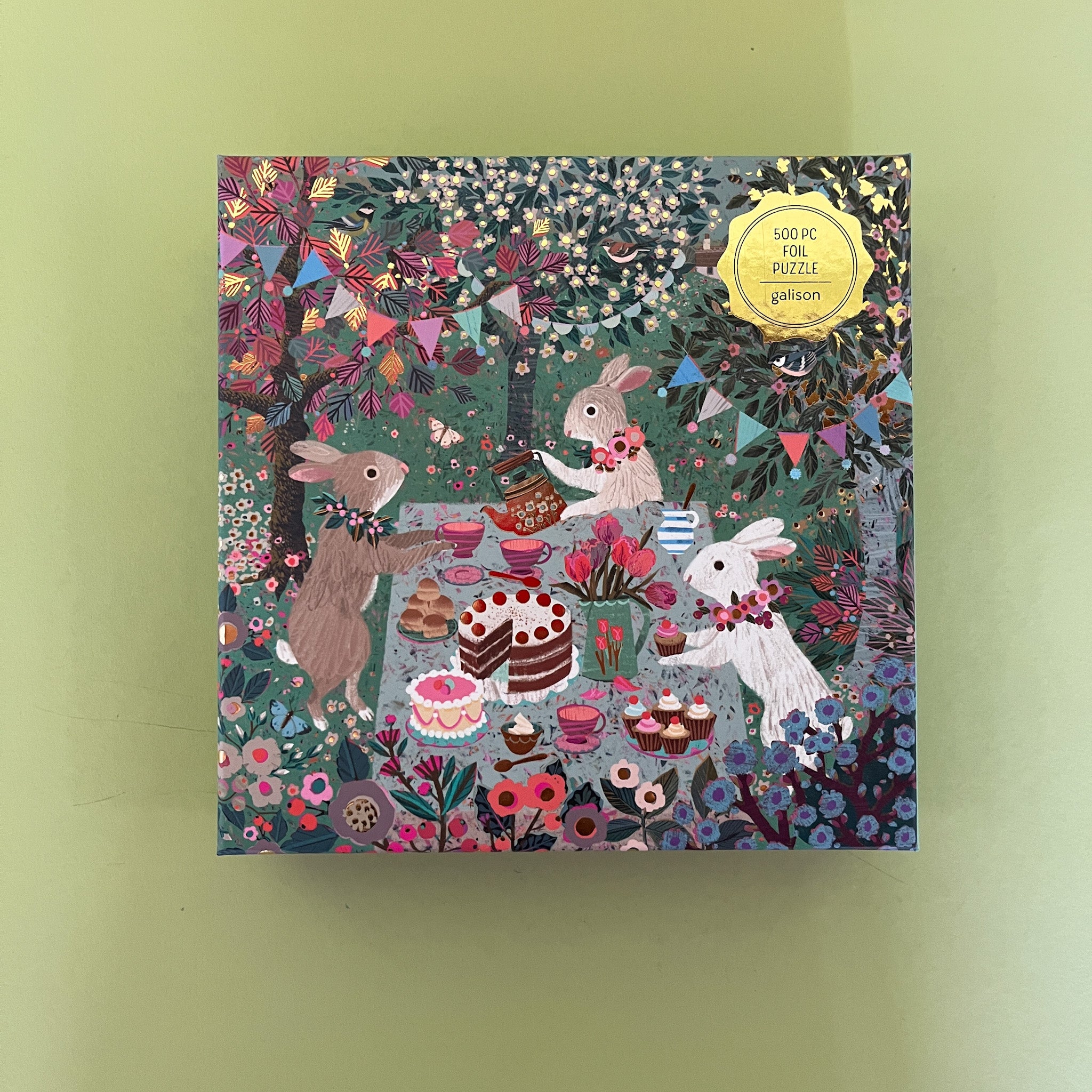 Join Mr. Bunny and his friends for a festive tea party scene in this beautifully colored 20"L x 20"W jigsaw puzzle.