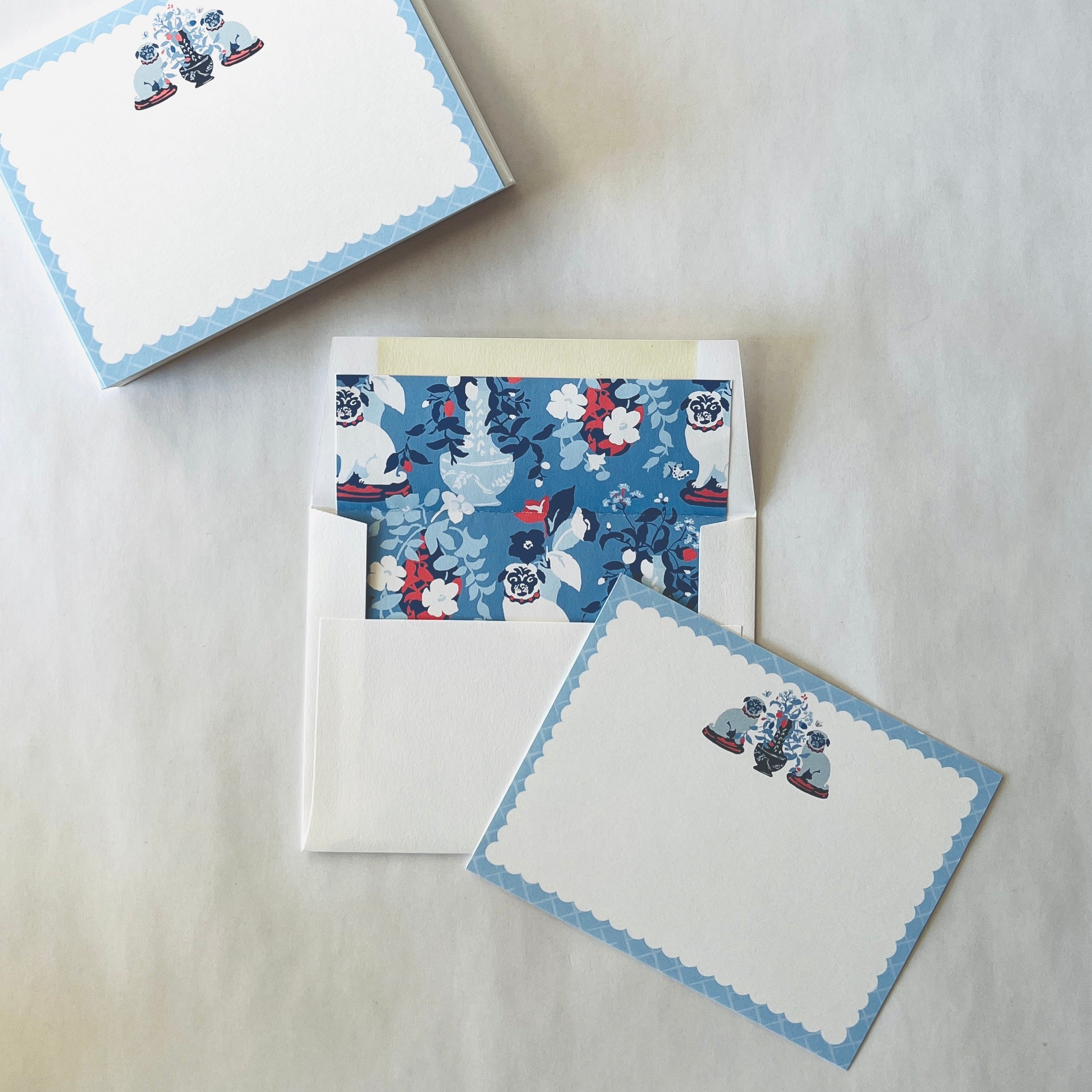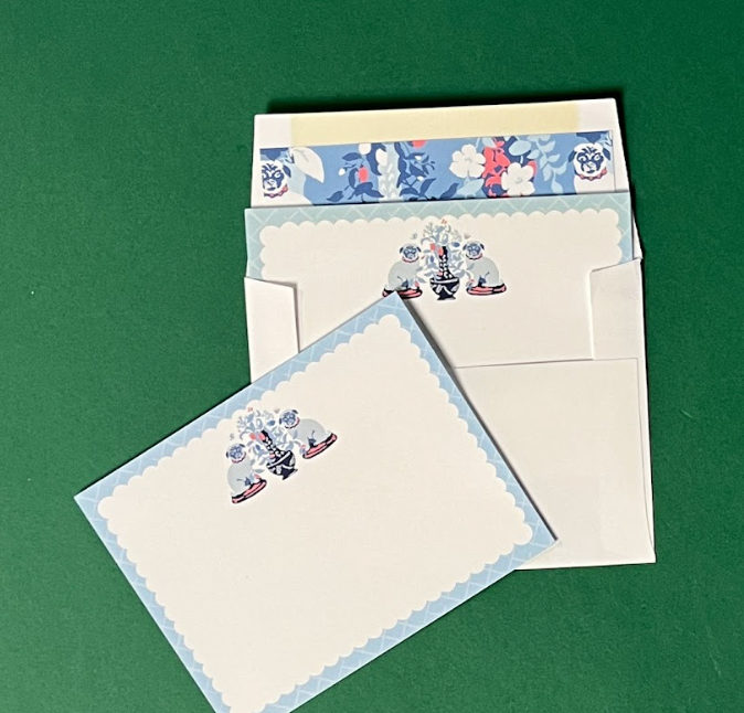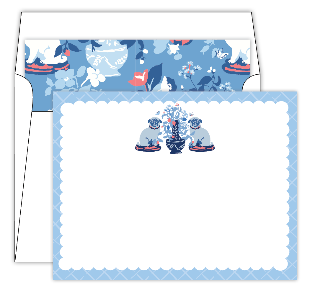 The Madcap Cottage gents have two amazing pound-rescue pugs, Weenie and Cecil, and this scampish duo inspired our timeless Imperial Palace pattern. Think pugs paired with a dash of Chinoiserie chic. Capture the magic with made-in-America, Imperial Palace Blue with Liner Social Sett of notecards and hand-lined envelopes.