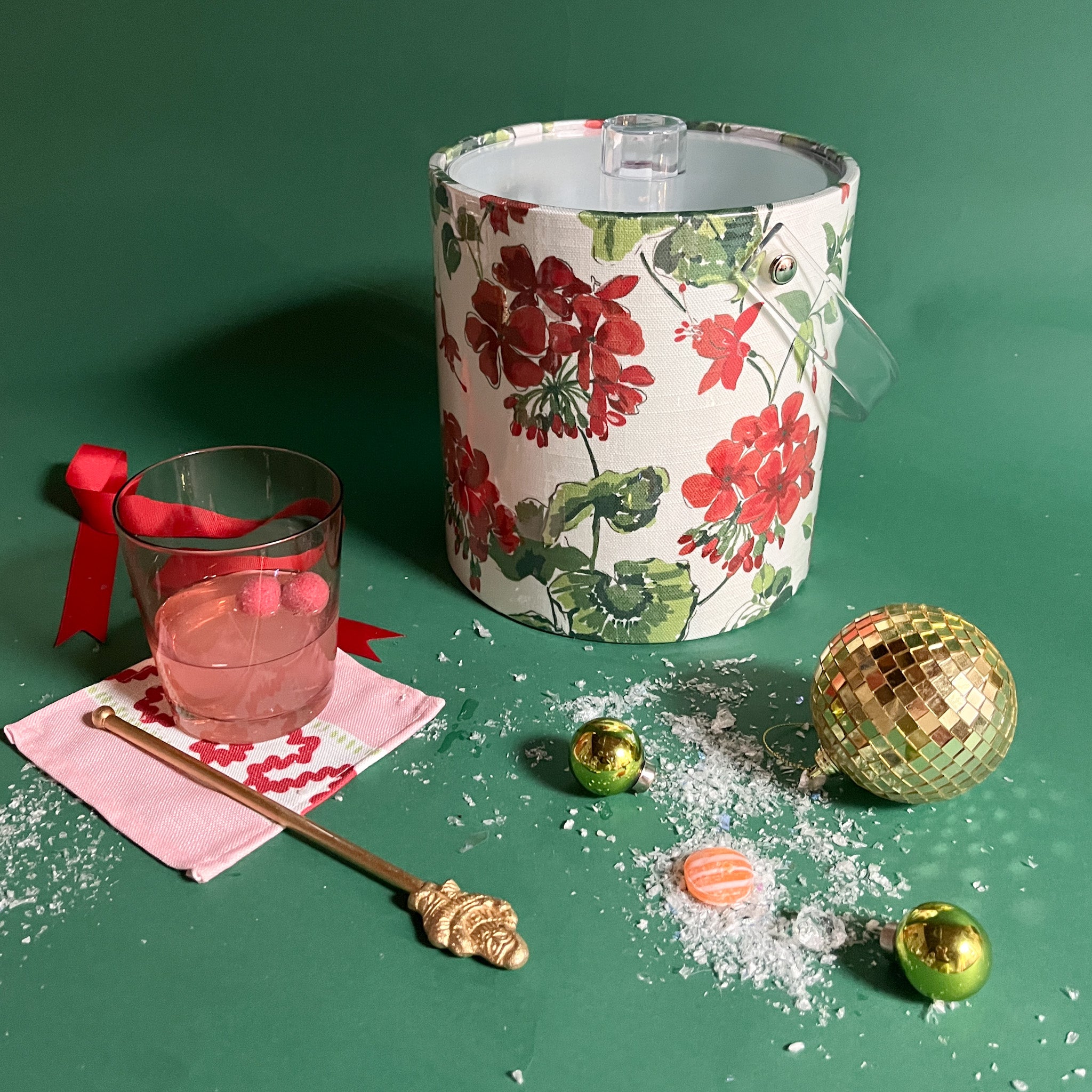 Made in America with Madcap Cottage fabrics, our 3-quart acrylic ice bucket with liner showcases signature Madcap Cottage geranium pattern that is timeless, fresh, and always fun. These ice buckets make for the perfect gift. Or gift yourself an ice bucket to take your bar from nice to absolute knockout. Double-wall insulated so sweat free. Holds ice for 3-5 hours.
