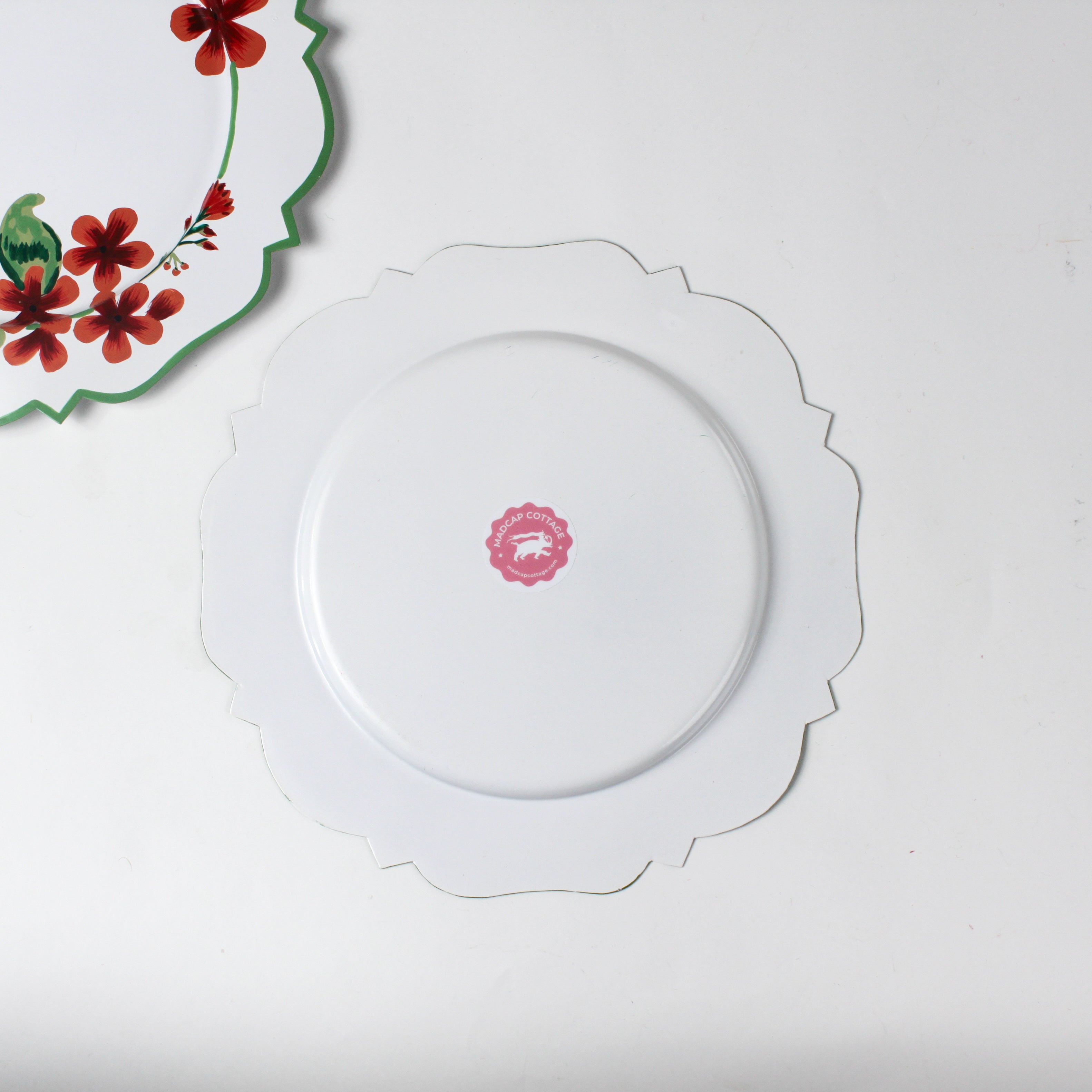 Hand-painted in India based upon Madcap's original designs, these Cottage Grove geranium tole-metal hand-painted chargers are emblazoned with our red, green and white geranium pattern and will take your holiday table from nice to knockout.