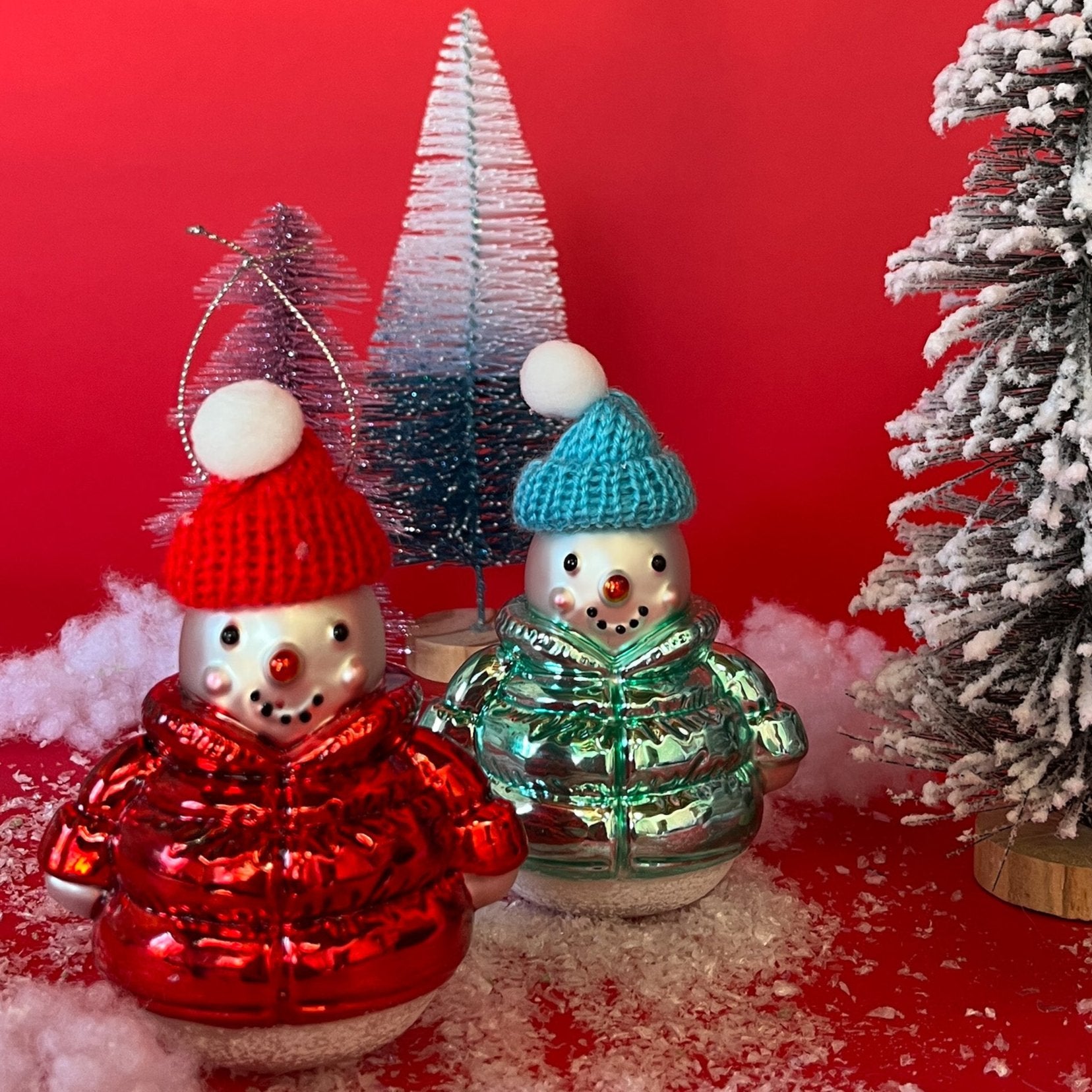 Glass, robust Jolly Snowman ornaments in shiny coats stand tall in their knitted caps topped off with kicky pom-pom embellishments. Absolute dreamboats.
