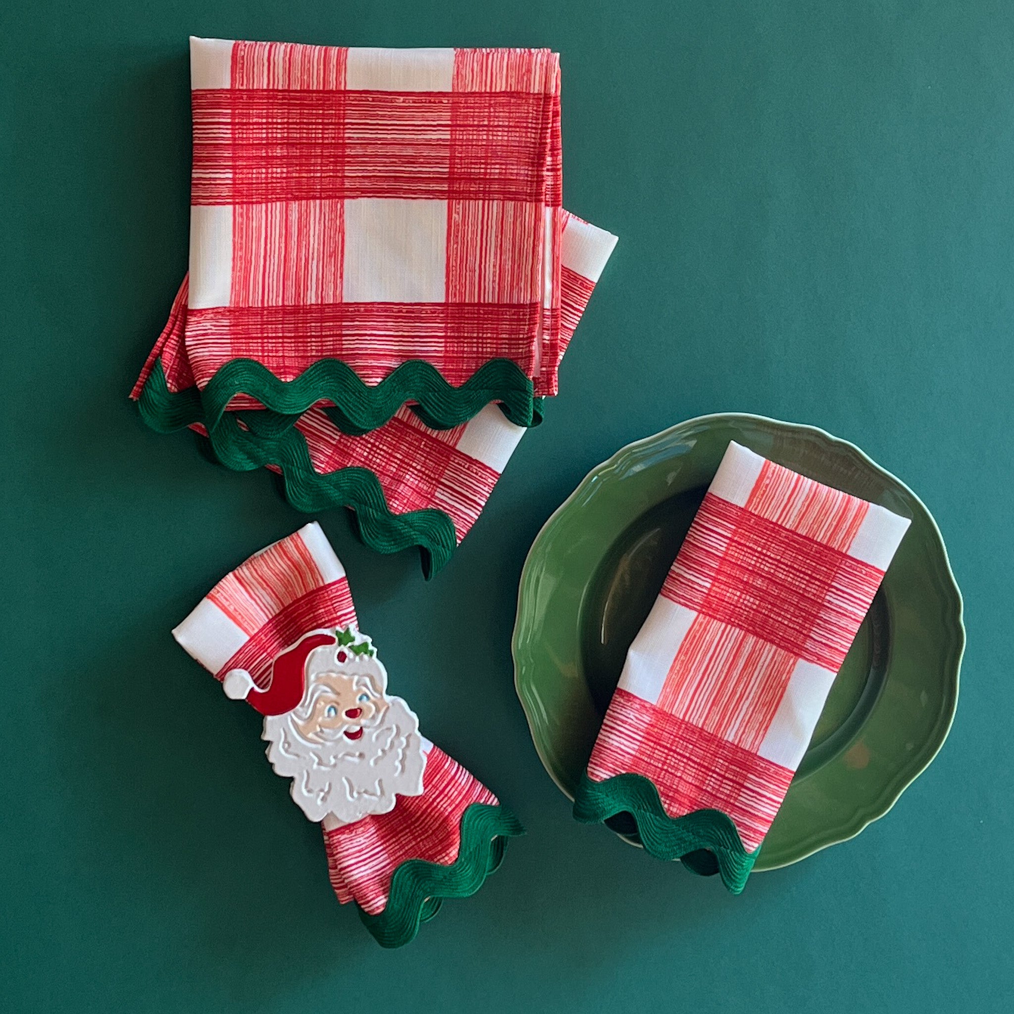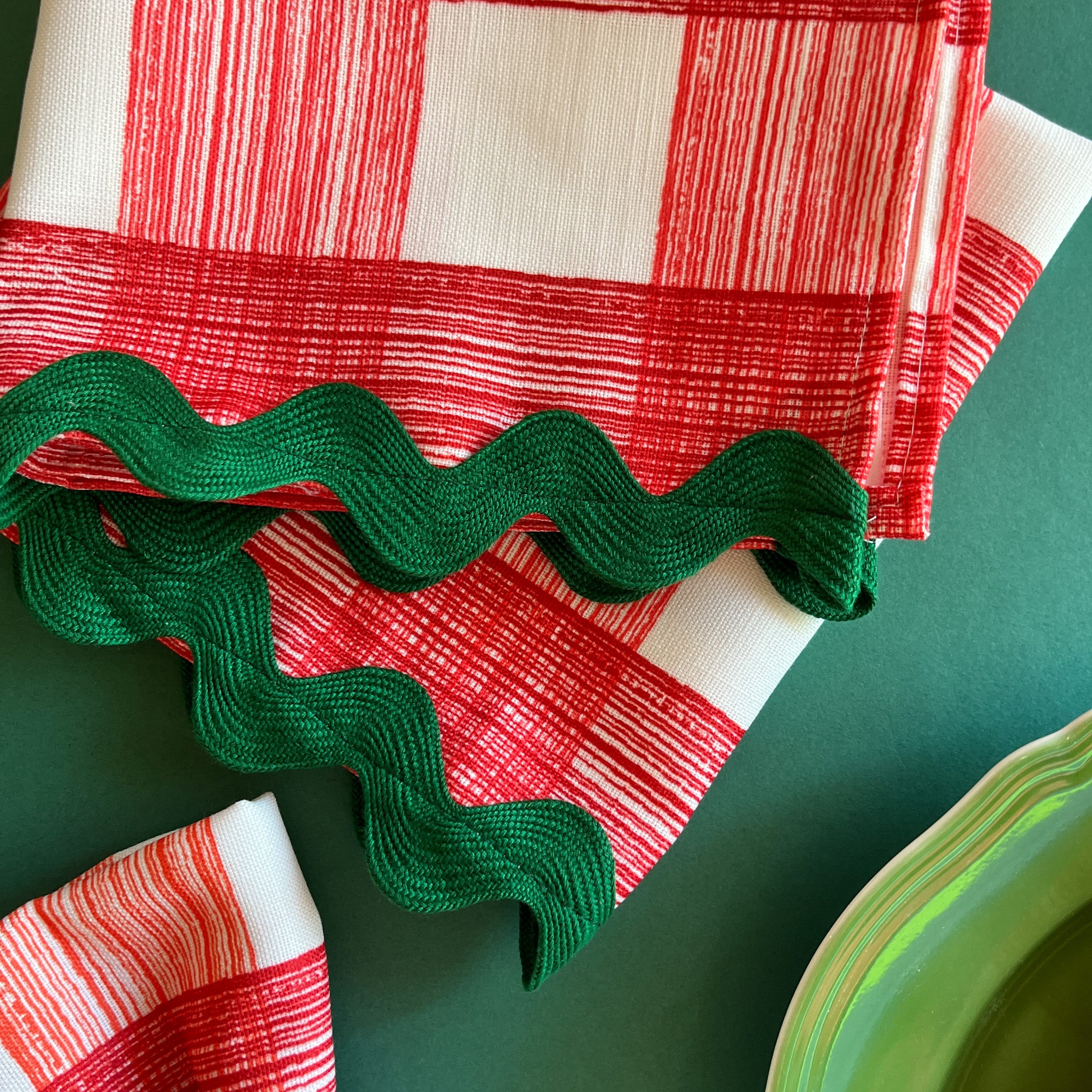 The Madcaps know how to host a rollicking dinner party—fun, lively, and never fussy. That’s why they created their Gin Lane red gingham cloth dinner napkins with ric rac trim to be machine-washable, no-iron, and effortlessly stylish. Made with a linen-like texture that feels refined yet relaxed, each napkin is finished with a charming green ric rac trim—the perfect blend to keep the festivities simple and never fussy.