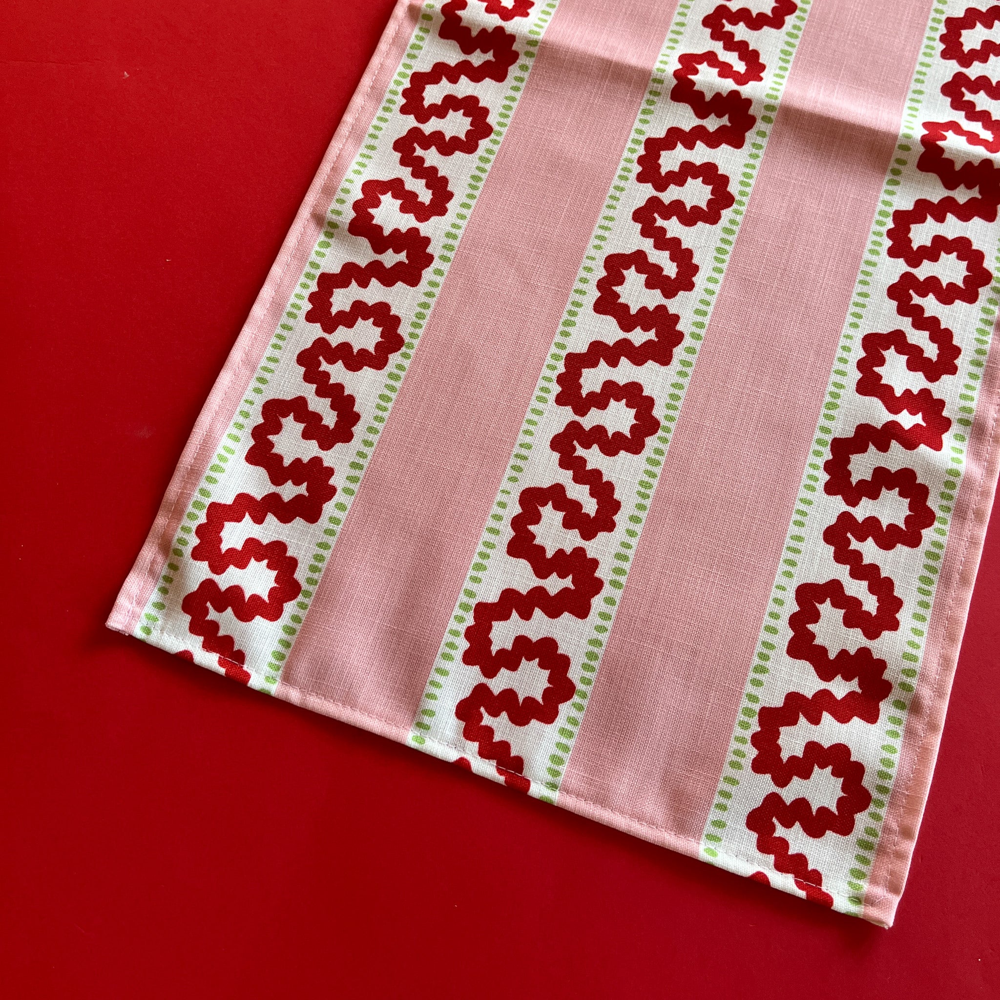 The Madcaps have crafted a range of no-iron cloth table runners--all based upon their original watercolor paintings and sketches--to add a whimsical focal point to your dining table. Here, Harbor Trail pink and red cloth table runner printed on a linen-like fabric. A Madcap Cottage exclusive.