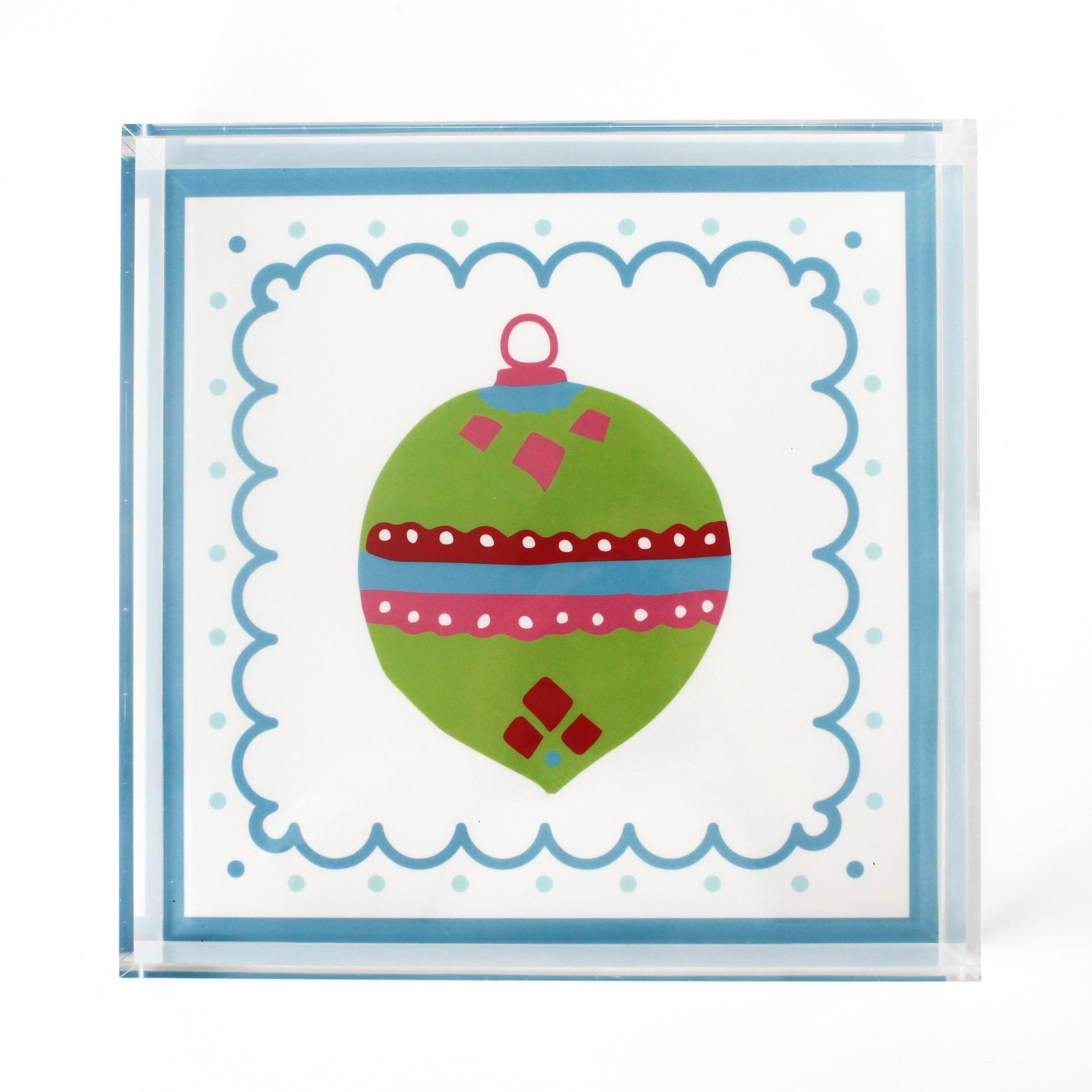 Inspired by Madcap Cottages original artwork our Christmas Ornament clear, square acrylic trays come in three sizes and feature integrated handles. Featuring three blue individual Christmas ornament designs, each is available in small, medium or large. A Madcap Cottage exclusive. Also available is our coordinating Darling Ornaments rectangular acrylic tray!