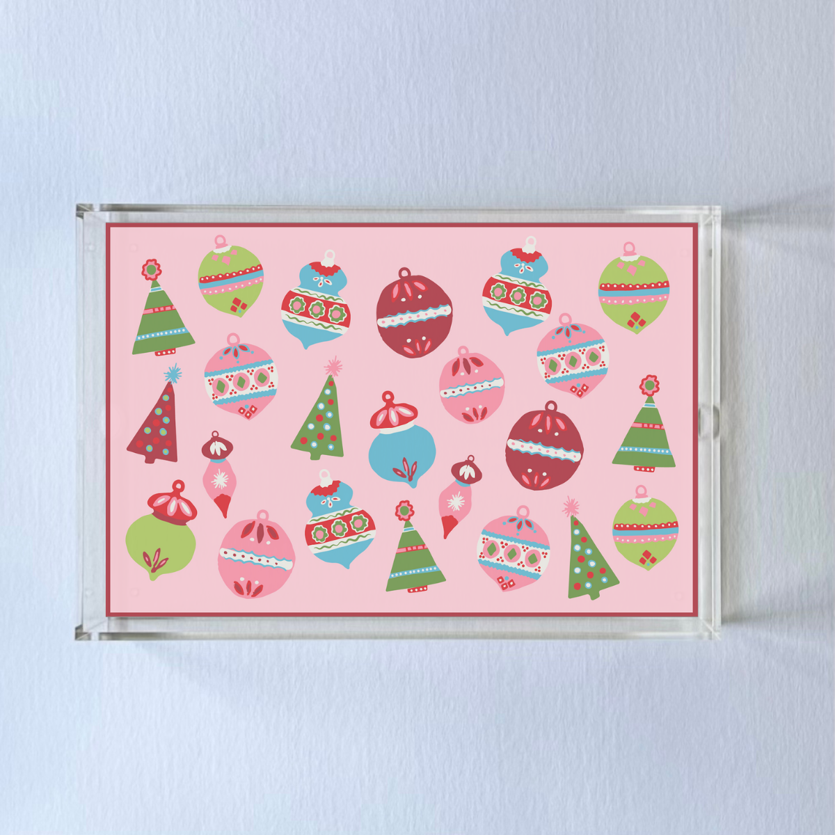 Ornaments Rectangular Acrylic Tray, in 2 sizes. Pink background with many bright colored ornaments and a red border.