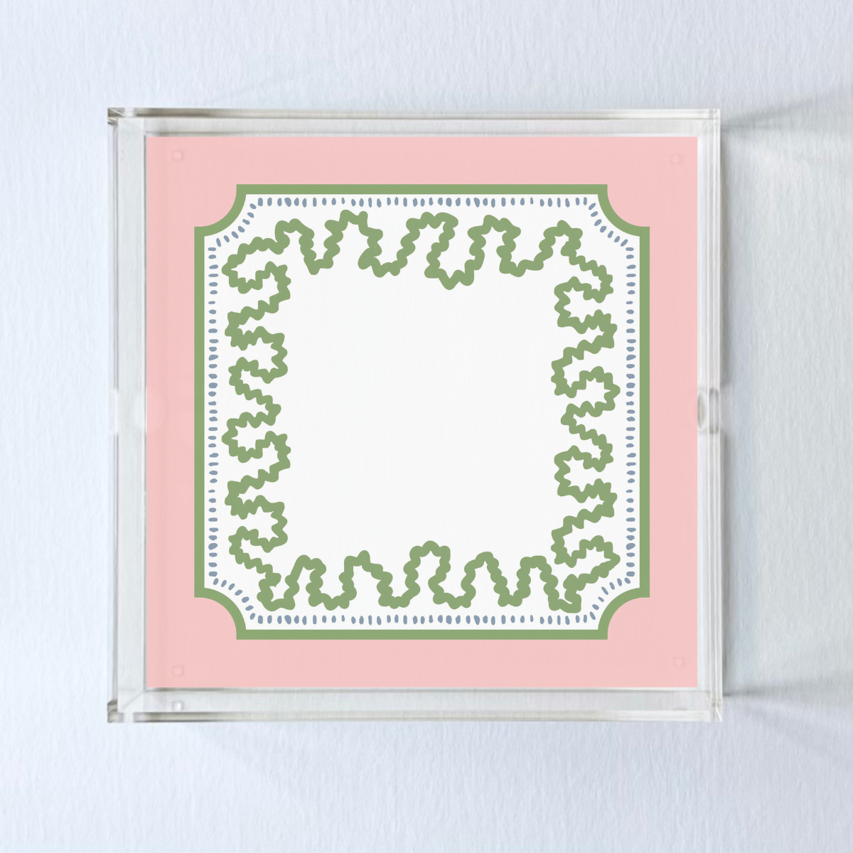 a square acrylic tray with a pink and green base featuring a green squiggle motif around the border.