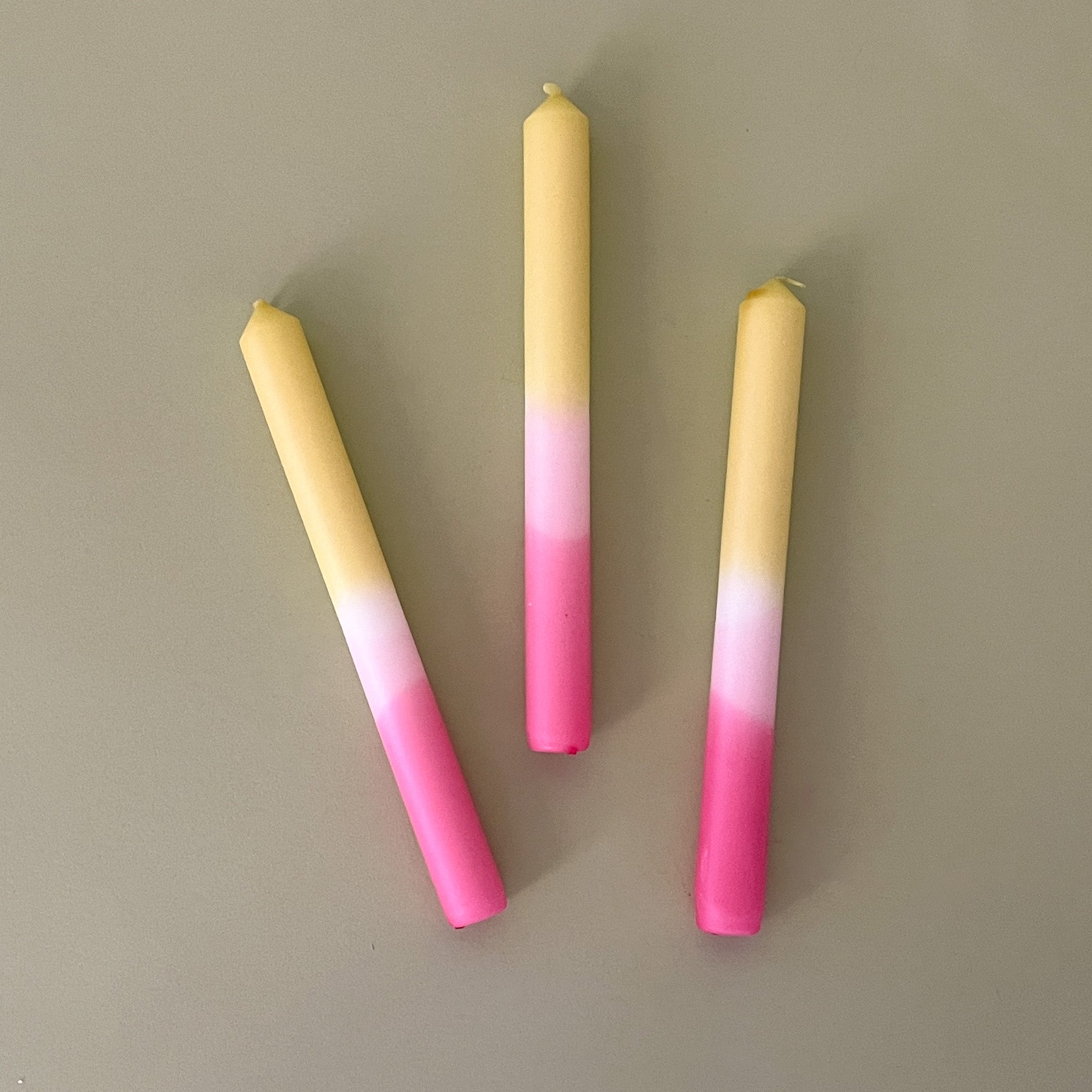 Imported from England, these magical, pink/green/white color-blocked hand-dipped taper candles will add glamour to your holiday tabletop. Plus they pair beautifully with our hand-made ceramic scallop-edge candle holders from Spain. Get lit in style. Made from unscented paraffin wax. Please note: Because each candle is made by hand, there may be slight variation in color patterning.