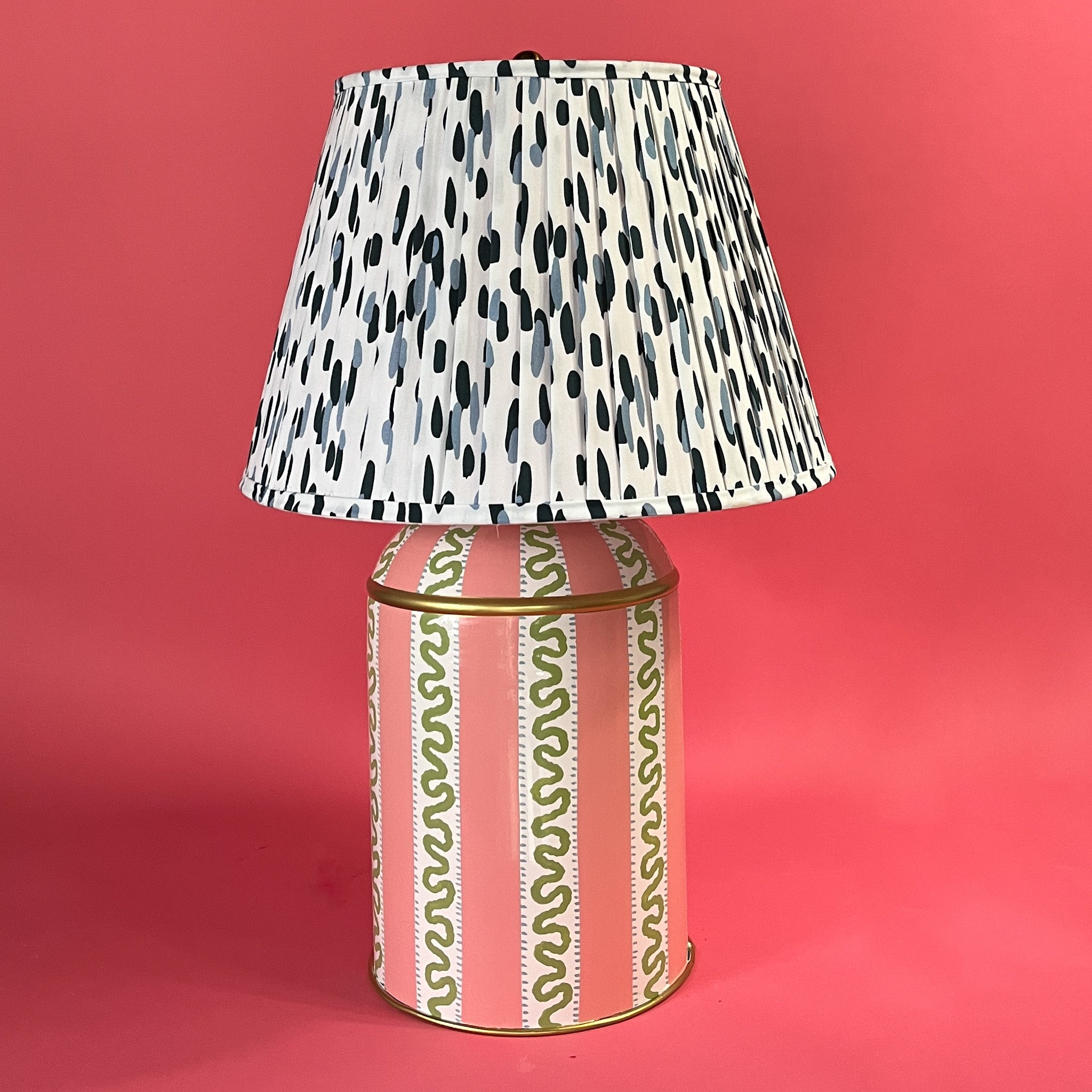 A hand-painted tole tea caddy table lamp featuring our best selling Harbor Trail pattern with its Palm Beach-plucked hues. Capture the timeless magic with this striped pink and green lamp that will add just the right punctuation mark to any room. Requires up to a 60W bulb.