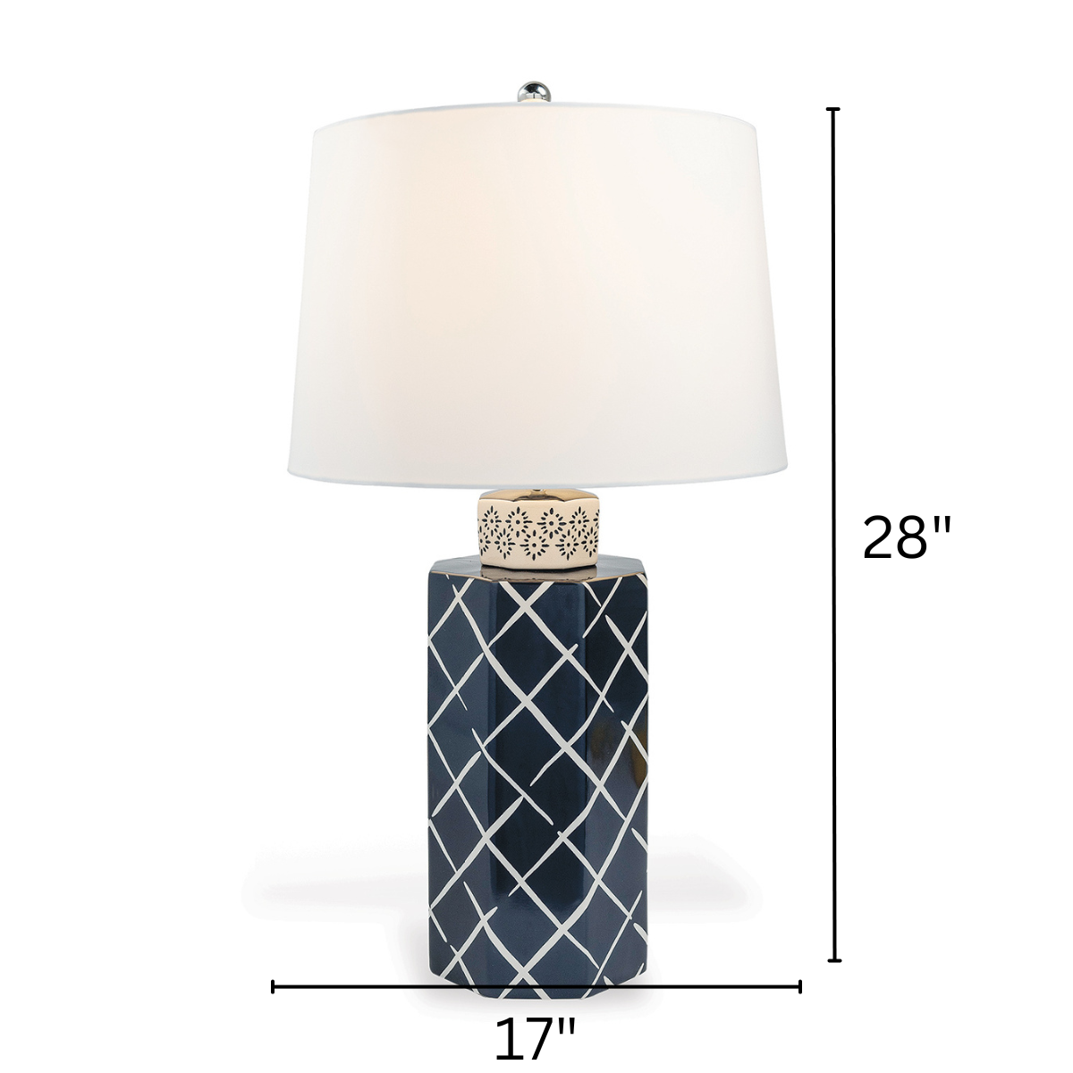A navy table lamp with a fabulous and fresh take on a classic lattice pattern with a painterly twist. A new classic in tried-and-true blue and white. The Bahama Court pattern is available as a fabric and wallpaper, too.
