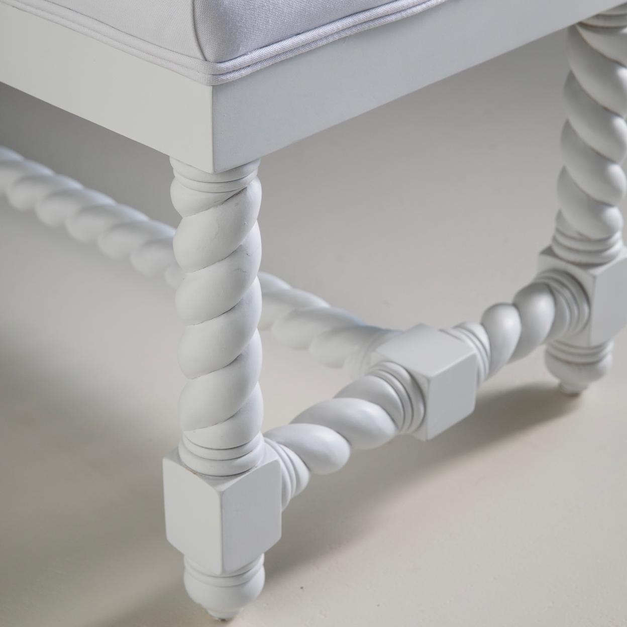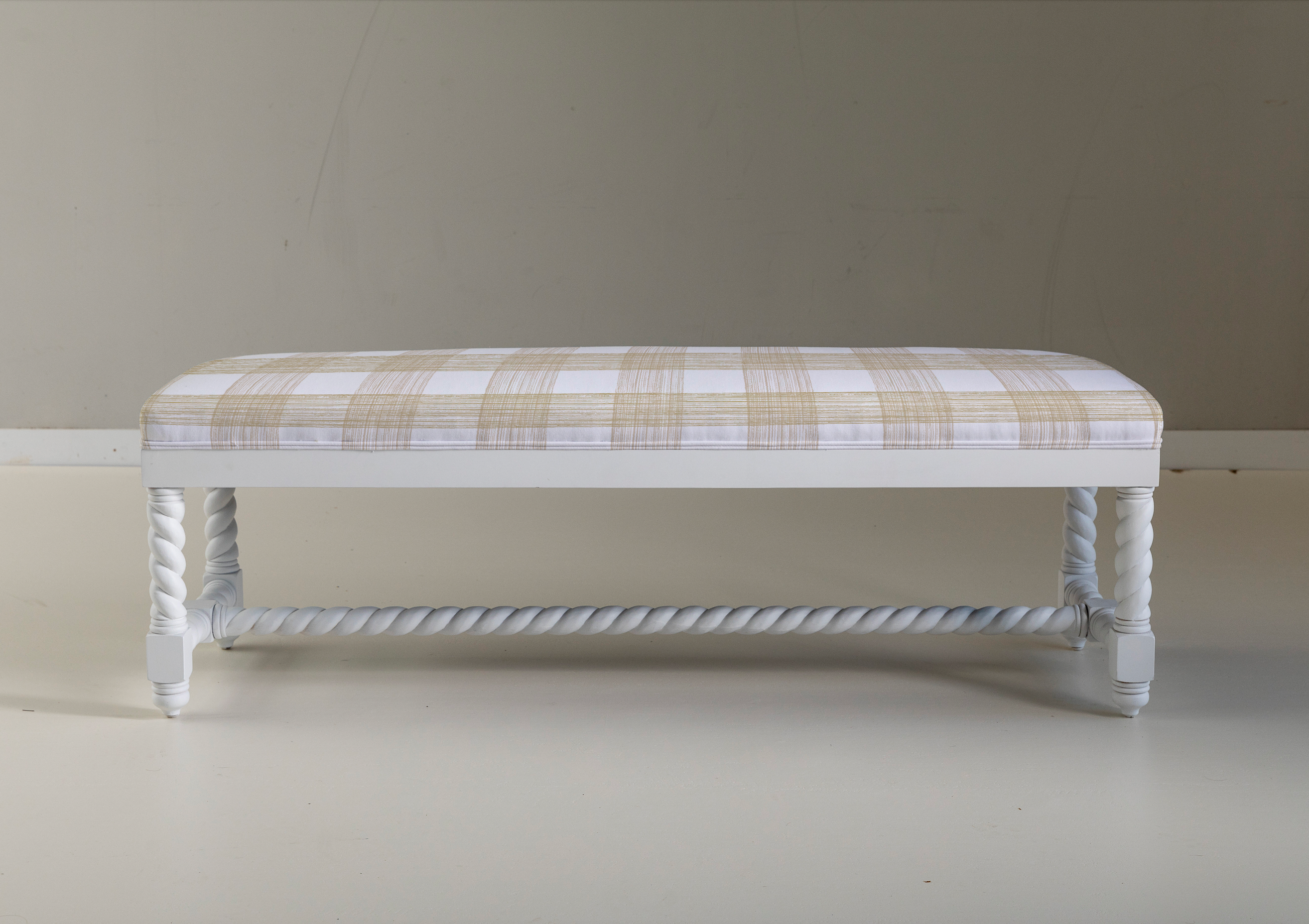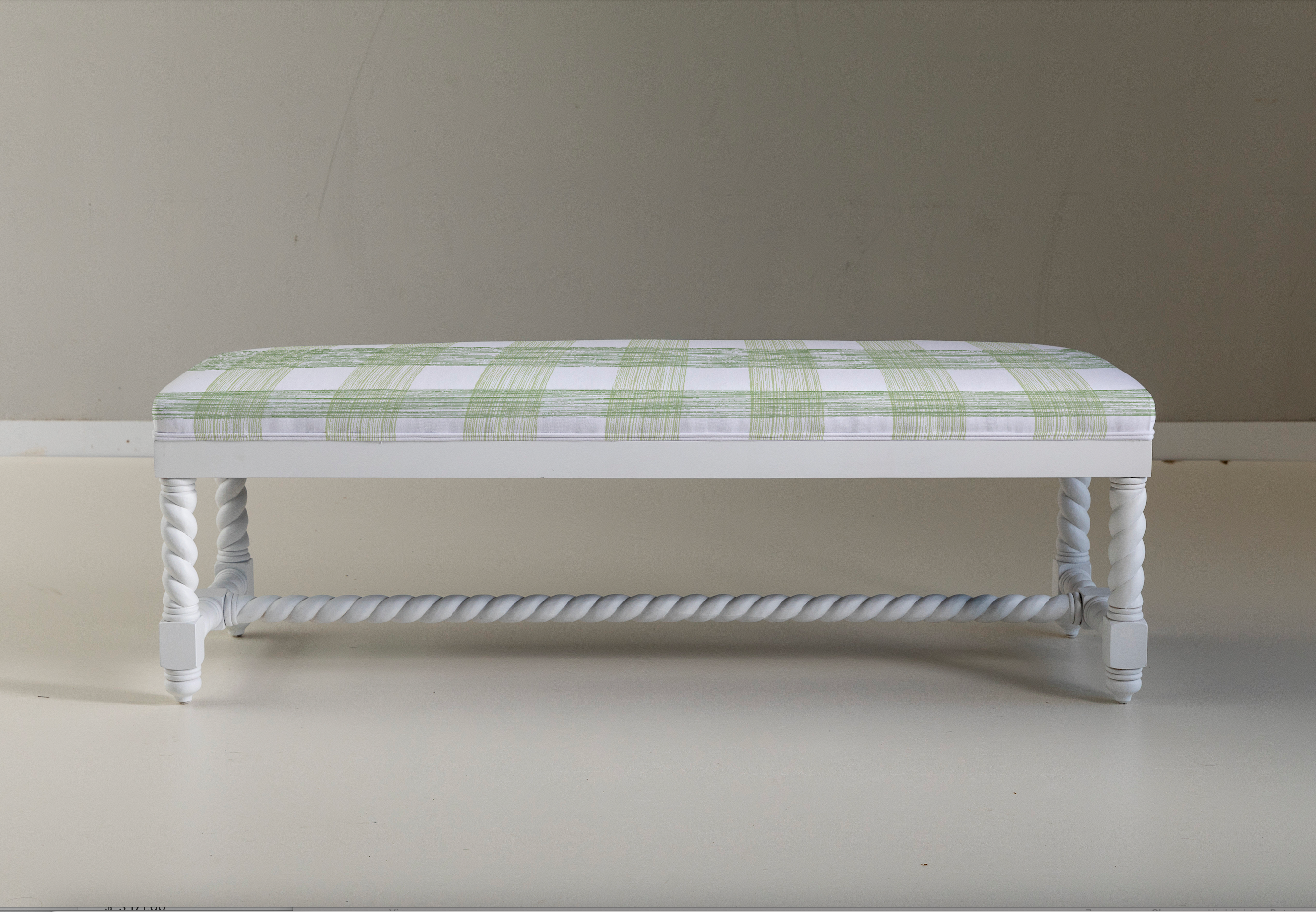 With its barley twist turned legs and stretcher, the Grand Tour painted-wood bench evokes a glorious antique “find” reinterpreted for today. Sized to fit the foot of a bed or perch in a hallway, this seat is a stylish essential. Exceptional detailing and beautifully sturdy construction. Frame crafted in Italy. Upholstered in High Point, NC. Available in six standard lacquer finishes or any color you desire.