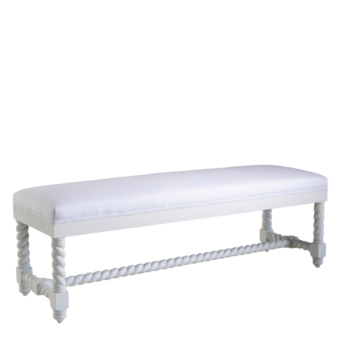 With its barley twist turned legs and stretcher, the Grand Tour painted-wood bench evokes a glorious antique “find” reinterpreted for today. Sized to fit the foot of a bed or perch in a hallway, this seat is a stylish essential. Exceptional detailing and beautifully sturdy construction. Frame crafted in Italy. Upholstered in High Point, NC. Available in six standard lacquer finishes or any color you desire.