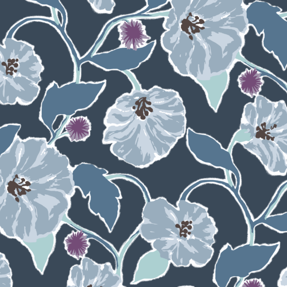 Our Jungle Garden tropical fabric  Indigo Blue features flowering vines swirling and twirling voluptuously against a dramatically colored background. Moody. Magical.