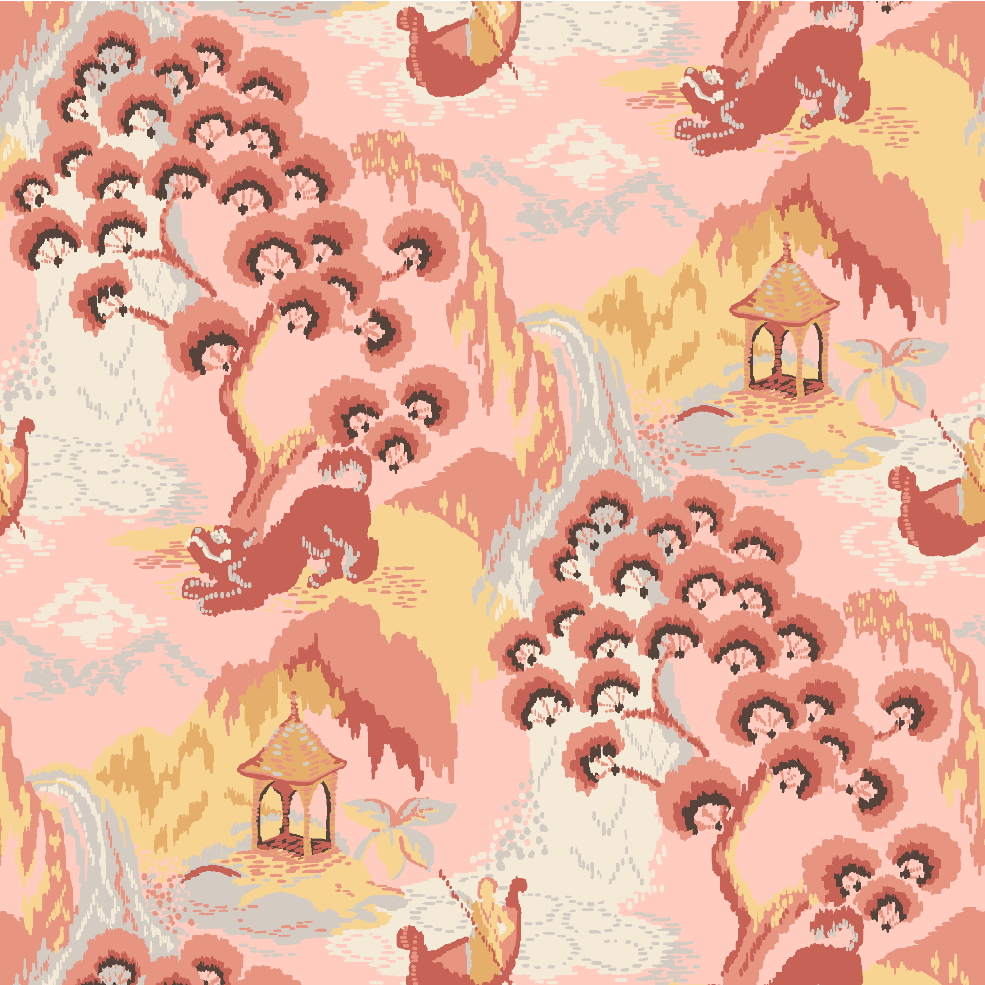 Inspired by the timeless, effortless chic of chinoiserie, this glorious textile in Bahama Pink boasts a stunning scenic that includes foo dogs, an errant boatman, and temple-like follies.