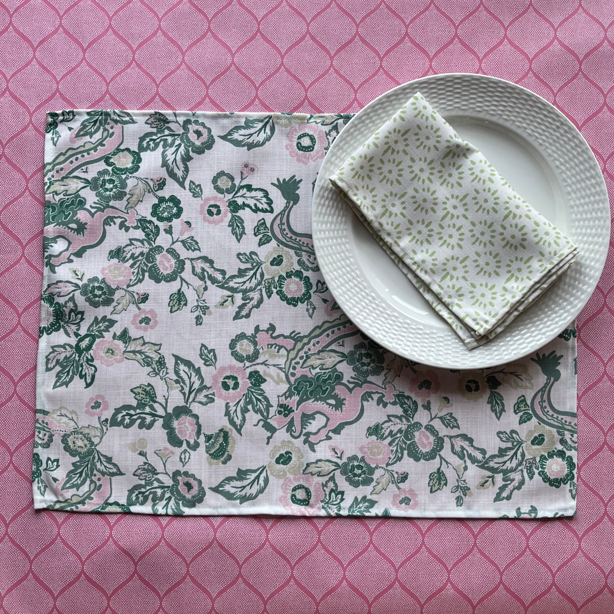 The Madcaps love to host a rollicking dinner party so they have crafted a line of washable, no-iron range of East of the Sun green and pink chinoiserie cloth placemats with a linen-like texture to keep the festivities simple and spiffy. A Madcap Cottage exclusive.