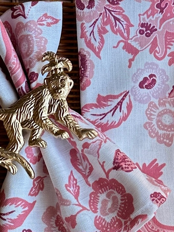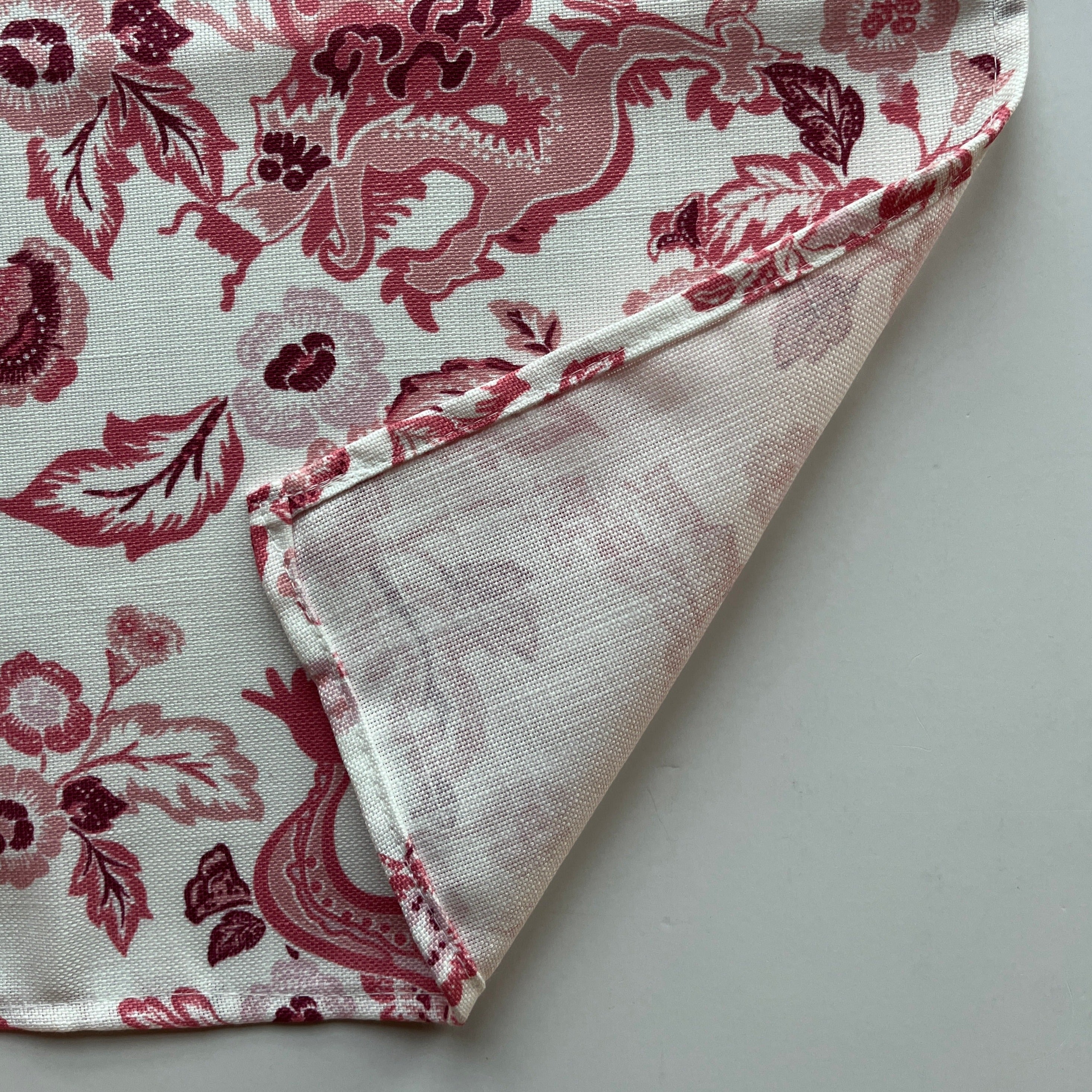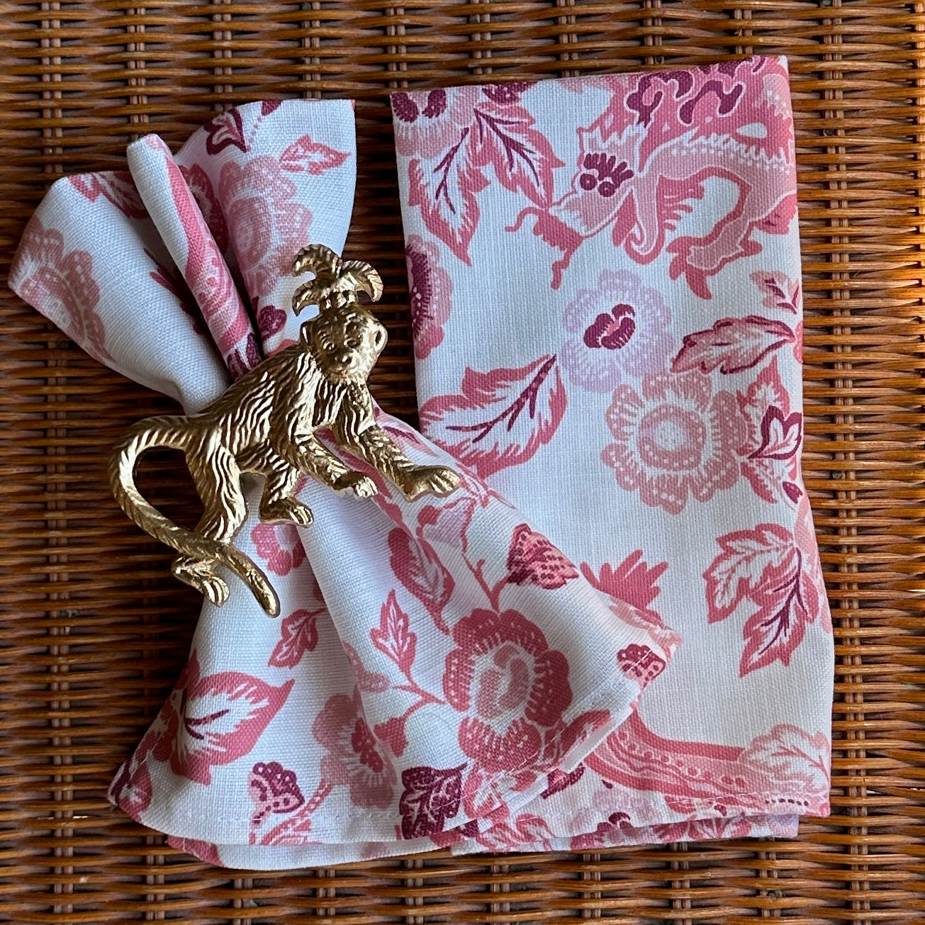The Madcaps have crafted these no-iron, made in America green cloth dinner napkins in our always popular Bahama Court print in red. 17” L x 17” W