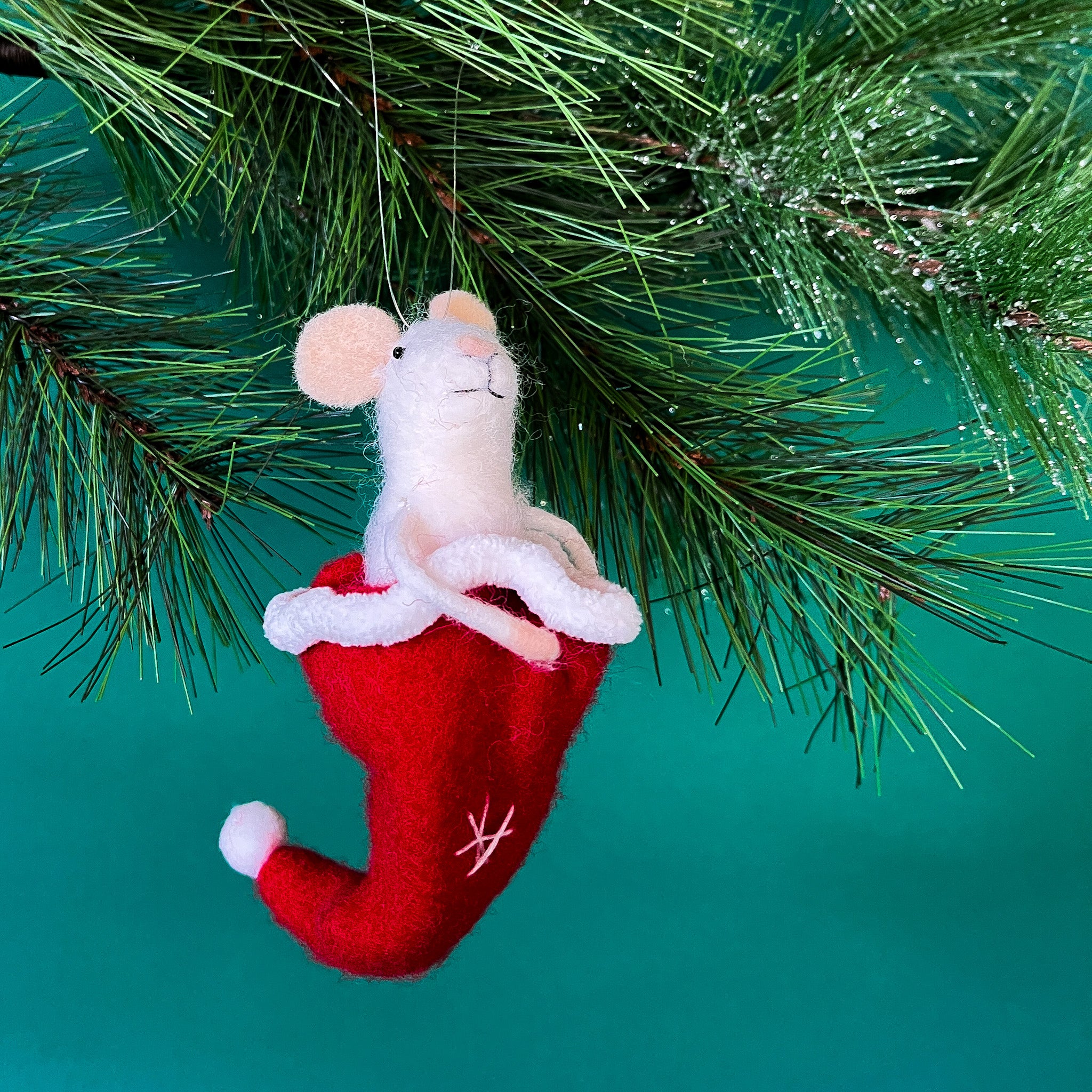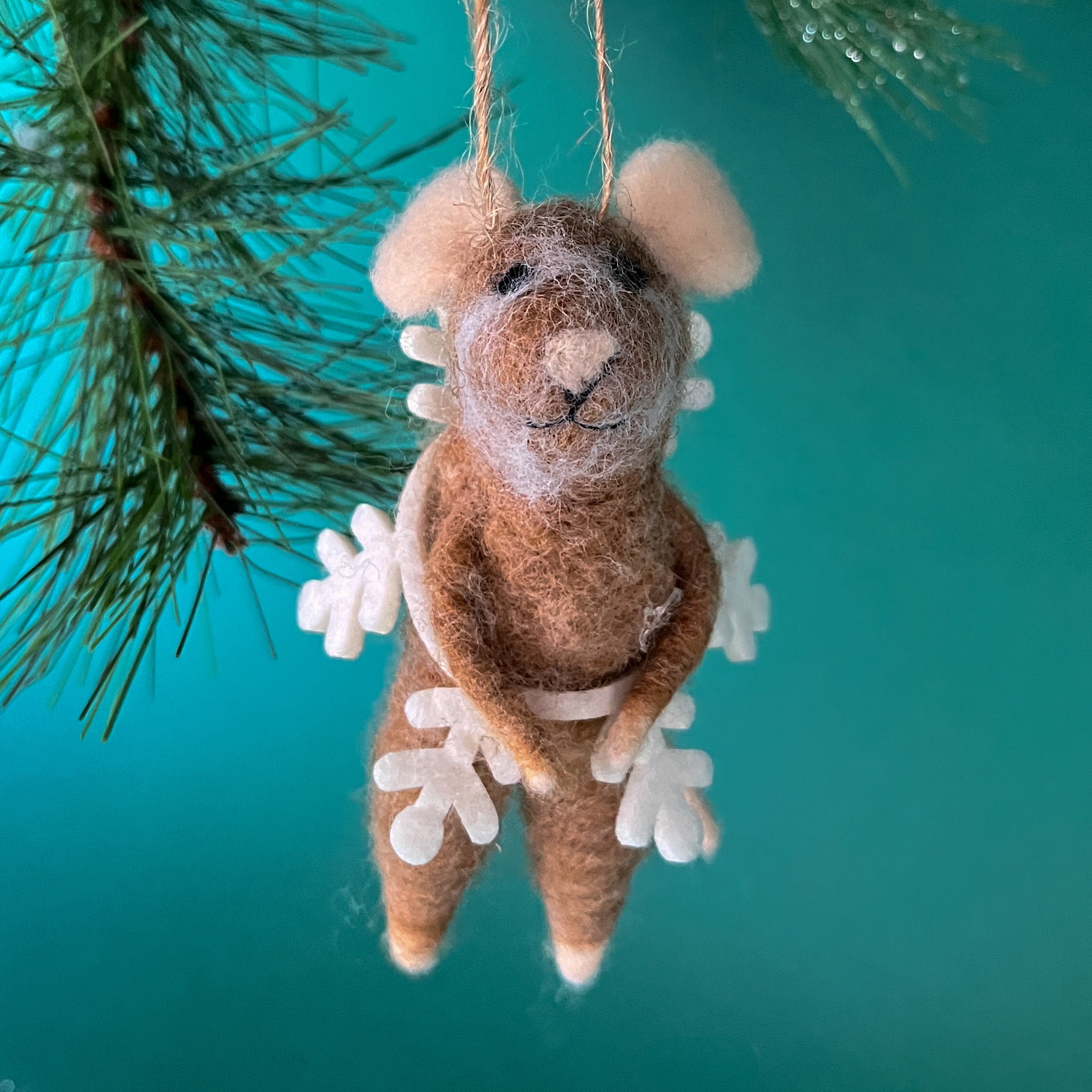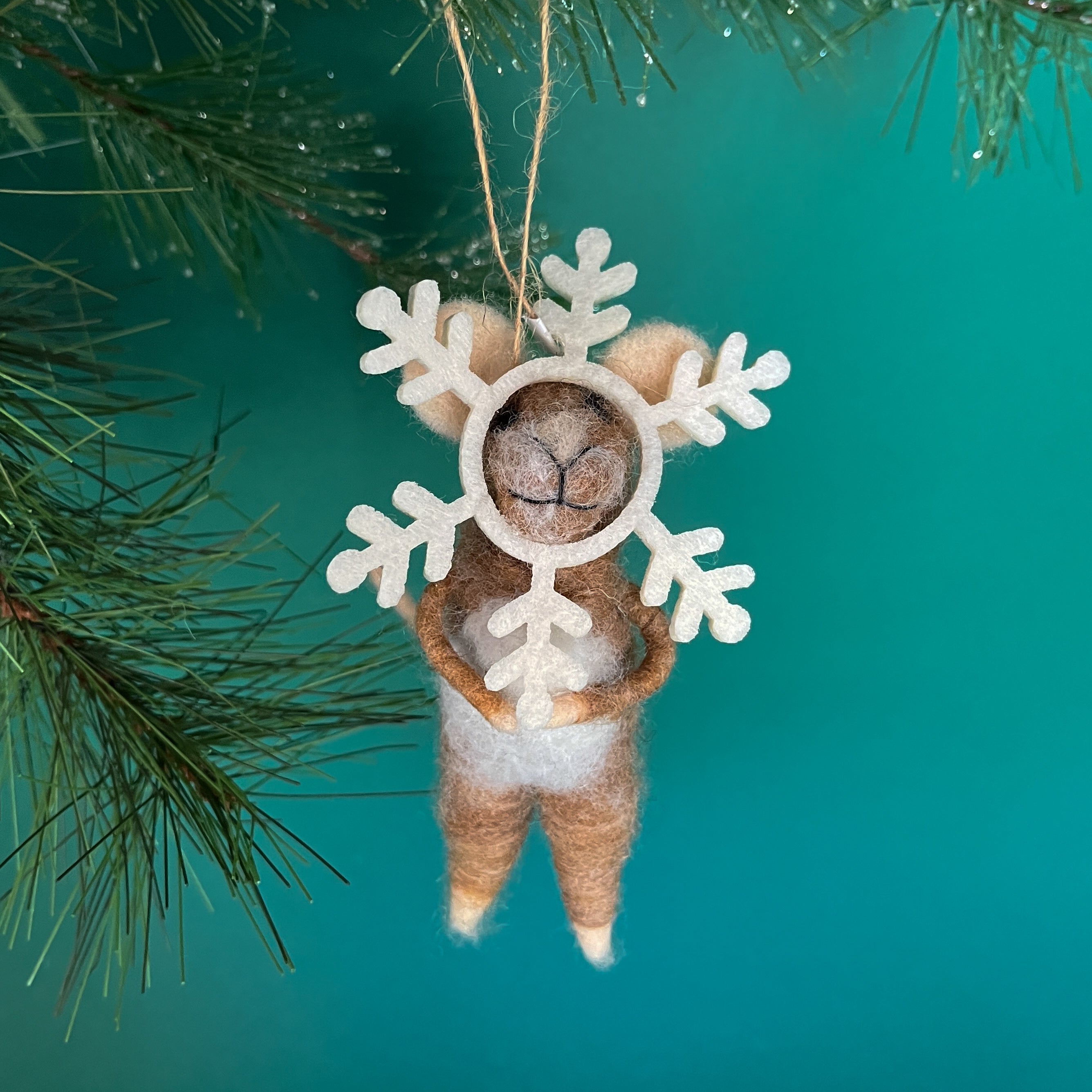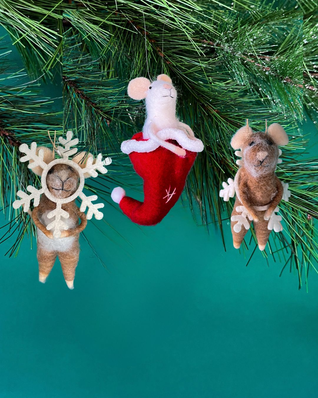 A charming set of three felt Snowflake and Santa Hat Mice ornaments having fun with intricate snowflakes and a fluffy red Santa hat on a wintry afternoon. We love the gorgeous details including their long tails and the charming expressions upon the their faces.