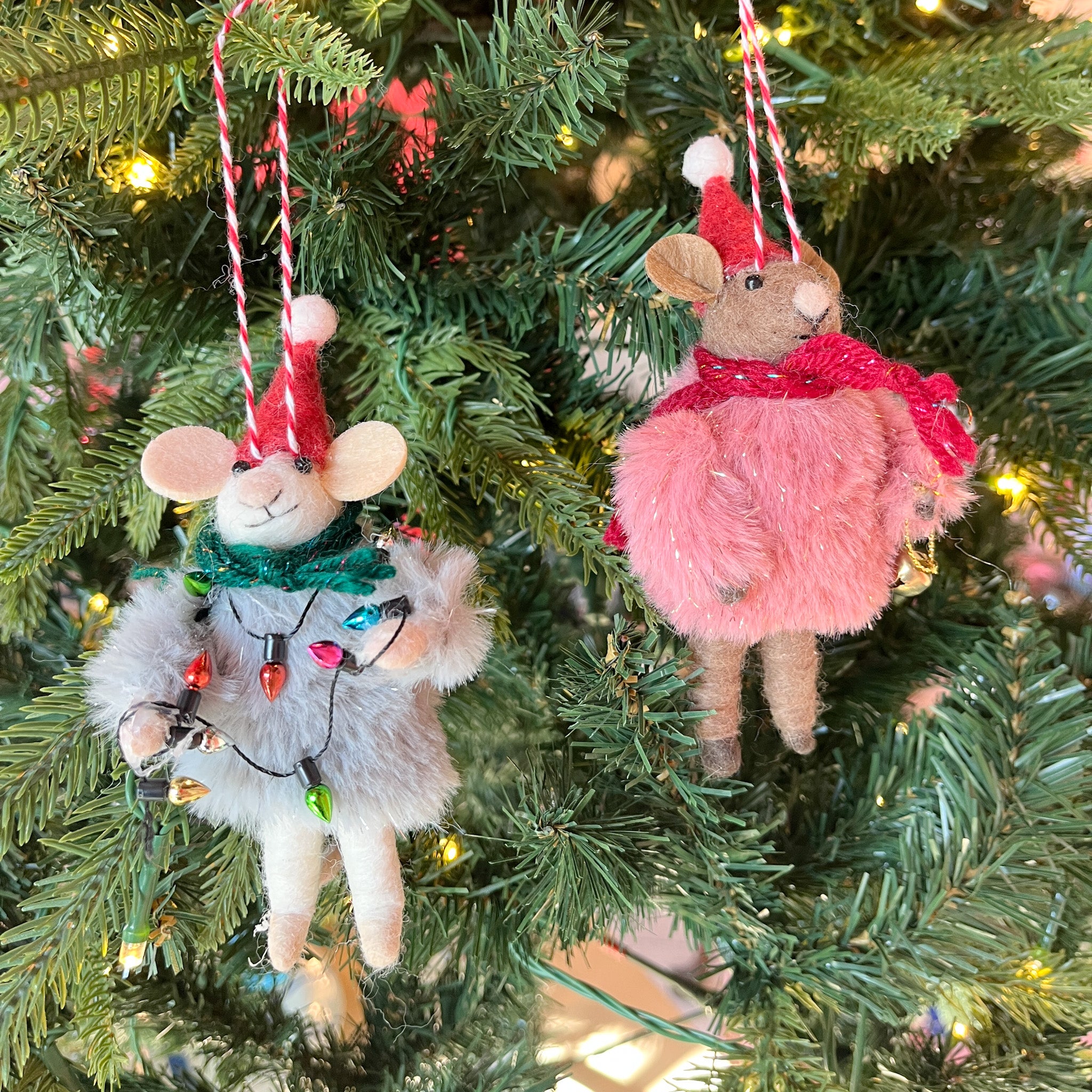 All dolled up in big fuzzy jackets with jaunty hats on and loaded up with gifts, these felt Holiday Party Fluffy Sweaters Mice ornaments, are ready to hit the neighbors' Christmas party in high-flying style. One mouse carries a wreath; another holds a bell; and the last has wrapped himself in Christmas lights.