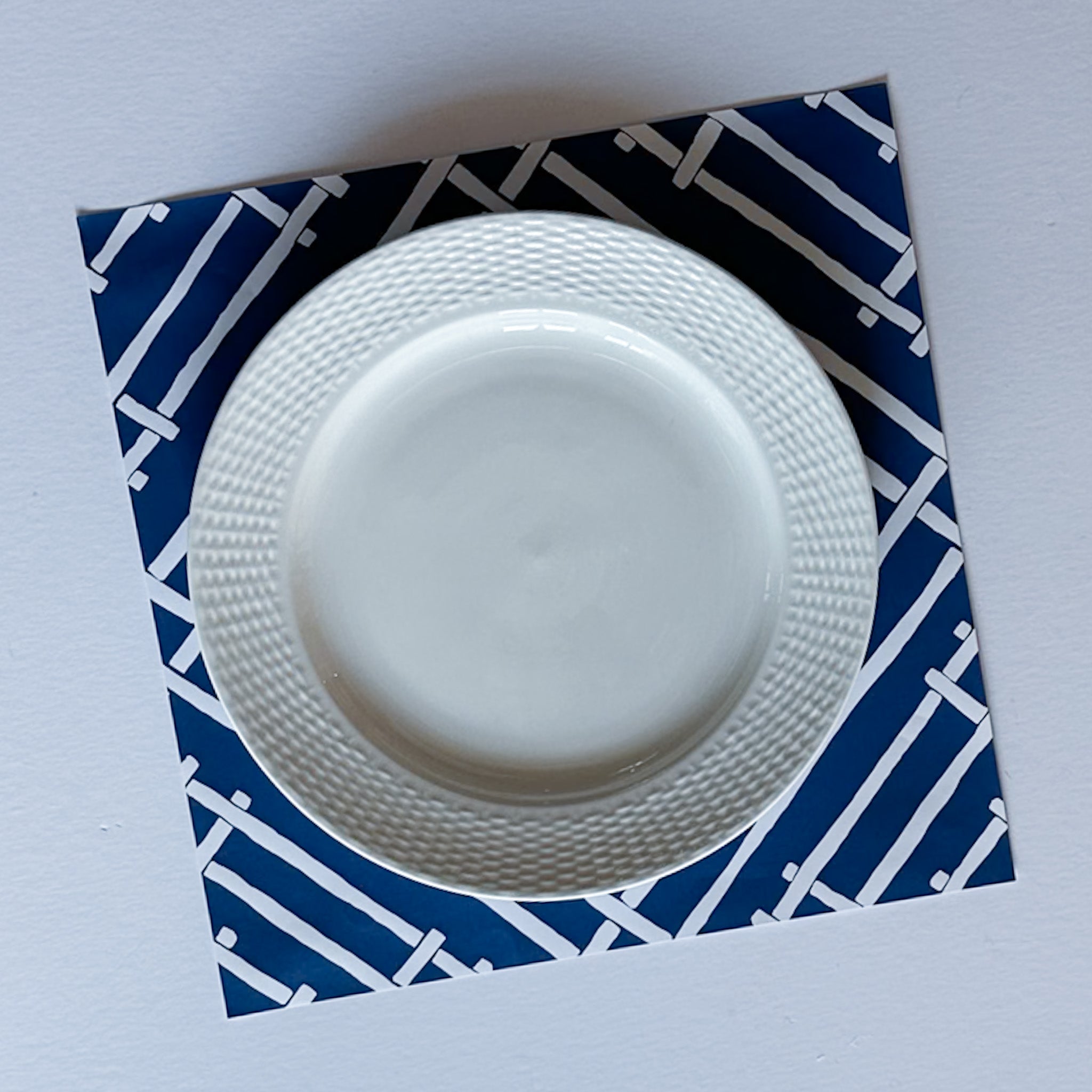 Set sail for glamorous Caribbean islands without ever leaving home courtesy of the form-meets-function, made-in-America blue square paper placemats in our bamboo trellis "Island House" pattern. Sadly, palm trees swaying in the breeze aren't included.