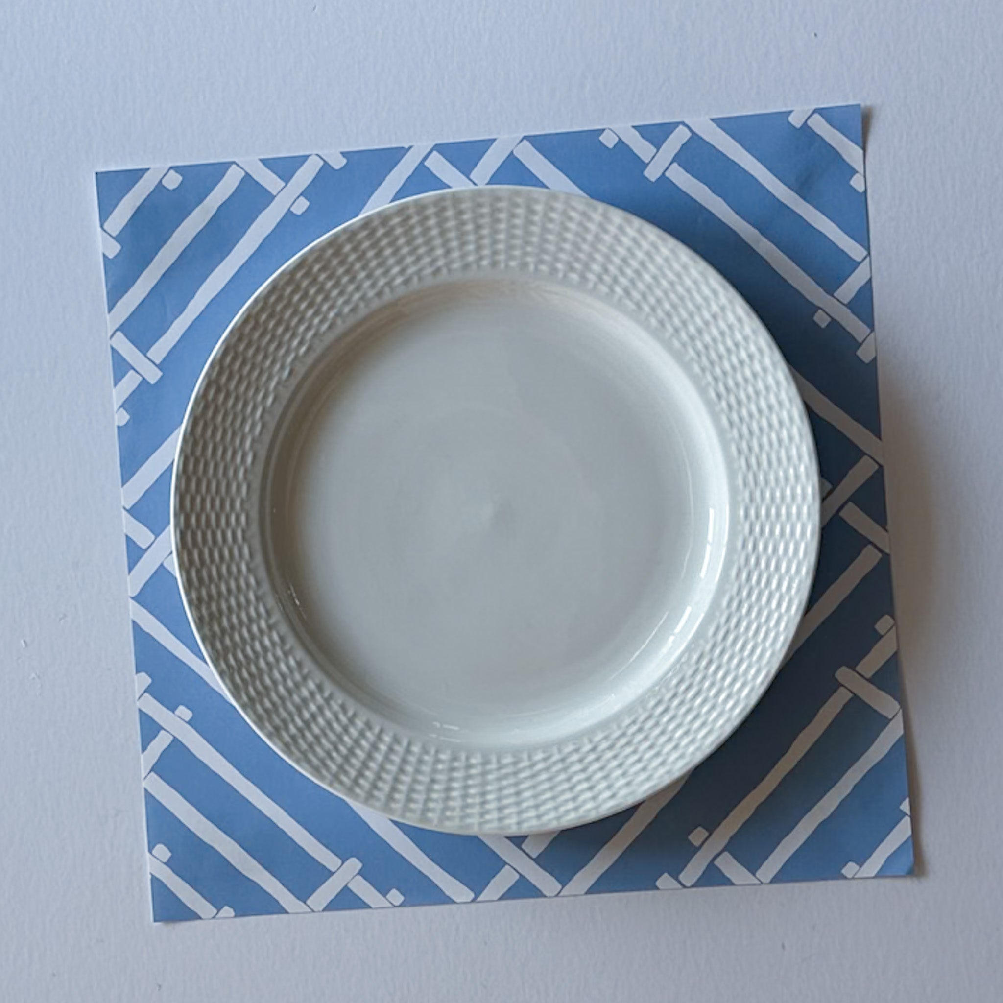 two square blue paper placemats with a white bamboo trellis design called "Island House" from Madcap Cottage.