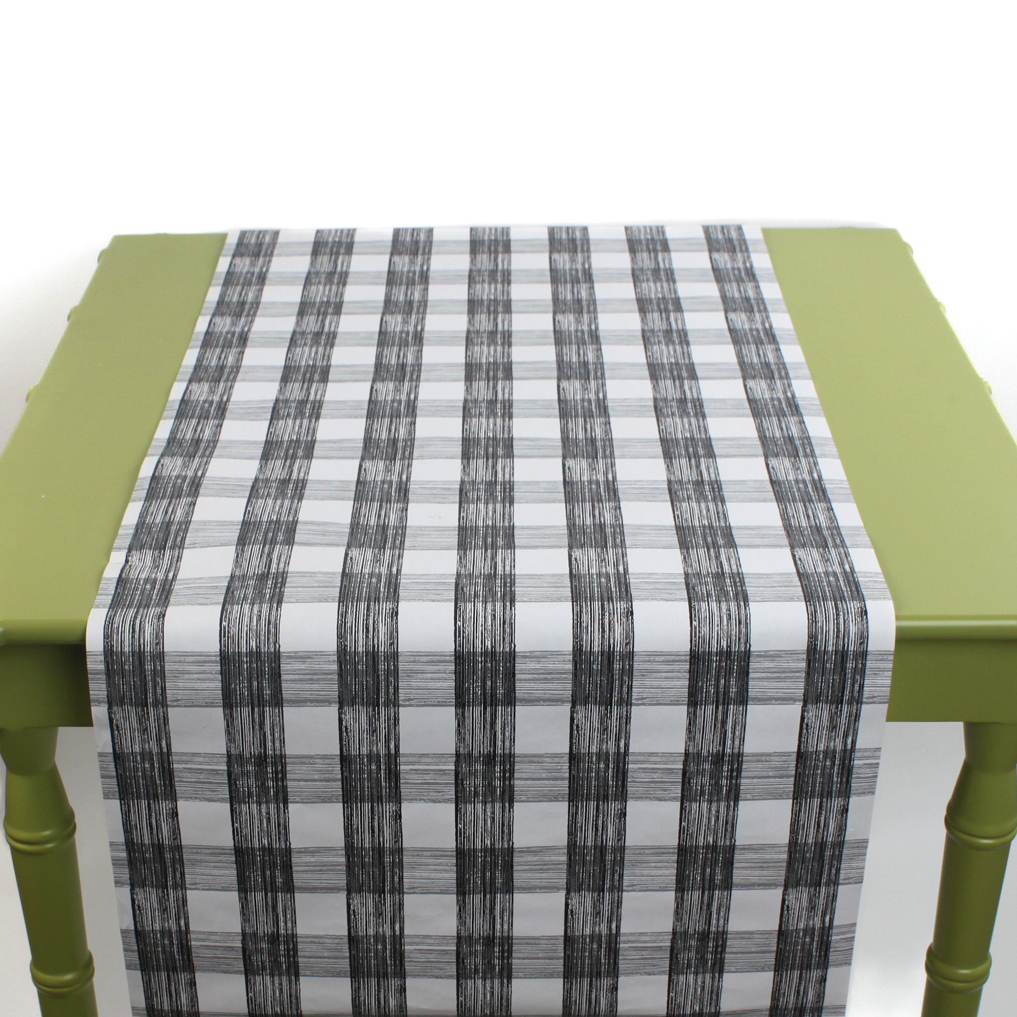 a black halloween paper table runner in a black and white gingham pattern from madcap cottage
