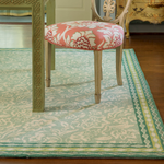 A touch of the exotic comes to life with the timeless, low-maintenance good looks of the Hampton Court wool rug in blue and green . Think bohemian Indian block-print-style glorious lotus blossoms and pomegranates wrapped within a bold graphic border. Timeless. Fresh. Inviting. Terrific for any space that demands a lot of “look” paired with function, this low-maintenance rug is made from hard-wearing wool. Perfect for a covered patio, porch, or any room with high-traffic demands. Pet- and kid-friendly.