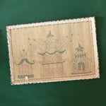 A trio of pagodas marches across this wonderful hooked wool pink and green rug that really packs a potent punch. Place one on either side of your bed or in a bathroom or kitchen!