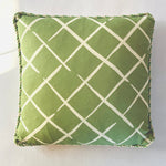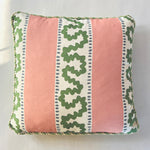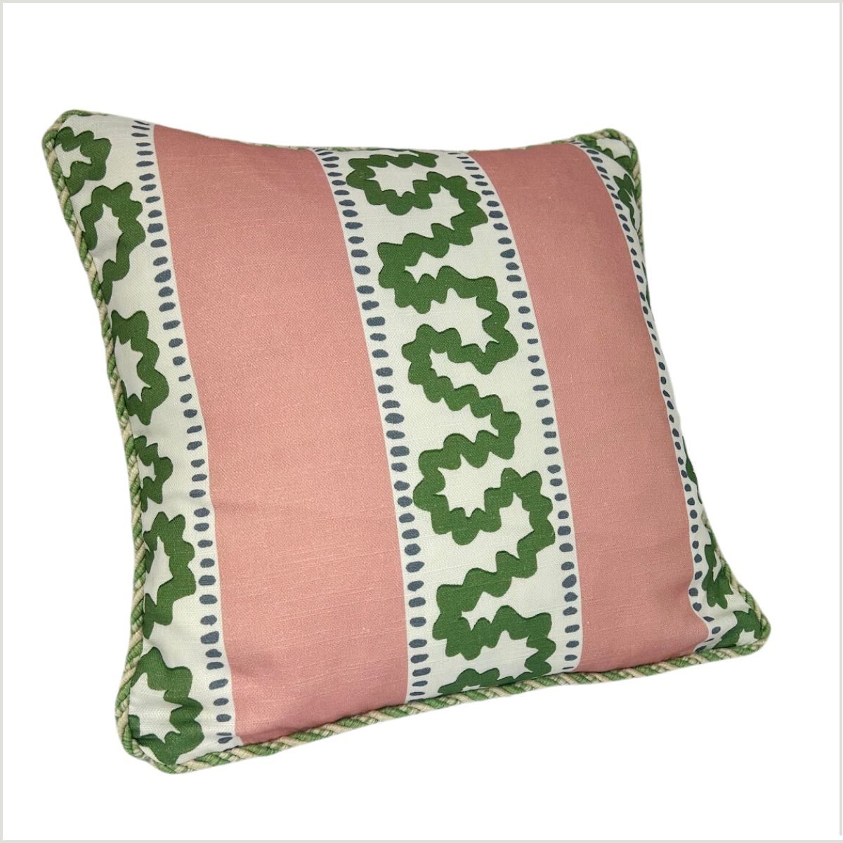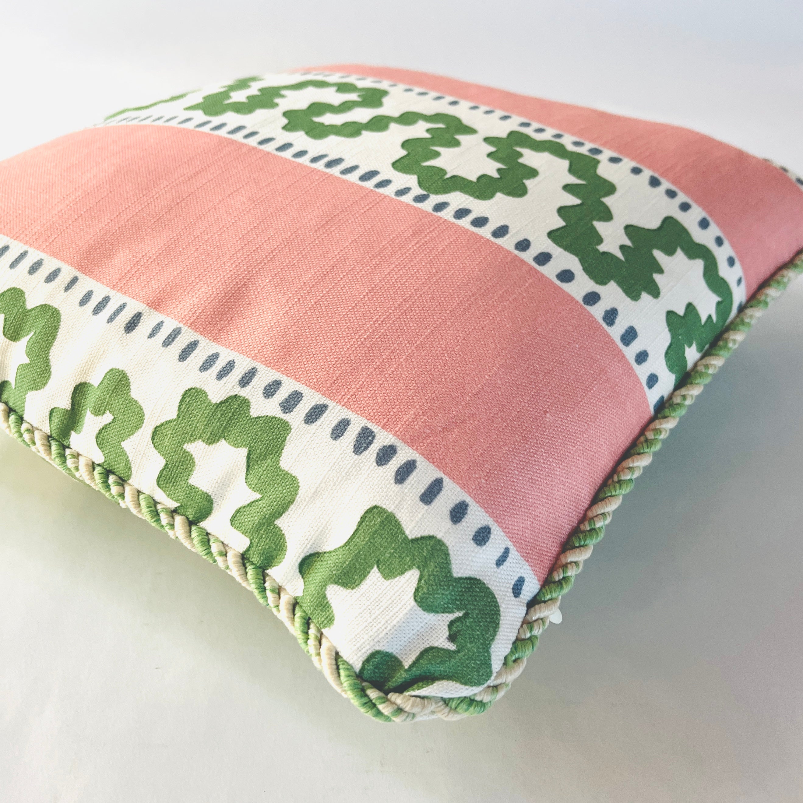 Our best-selling Harbor Trail in Bahama Pink fabric serves as the perfect foil to the classic good looks of our Bahama Court in Palm Green trellis on this stunning, attention-grabbing pillow. Layer-in Knot’s Landing performance ¼” cord with flange trim in Barbados Green, and it’s wow, wow, wow. Features a hidden zipper.