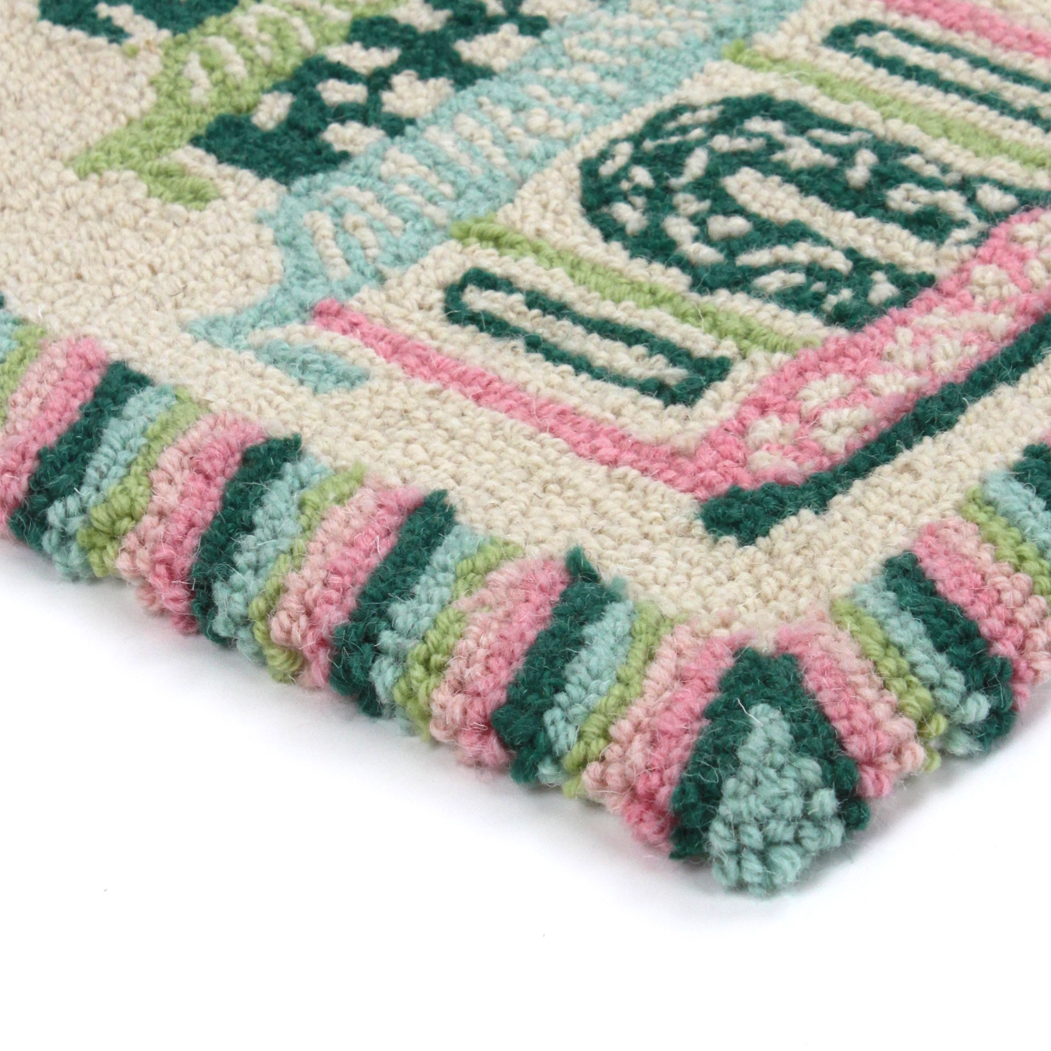 A trio of pagodas marches across this wonderful hooked wool pink and green rug that really packs a potent punch. Place one on either side of your bed or in a bathroom or kitchen!