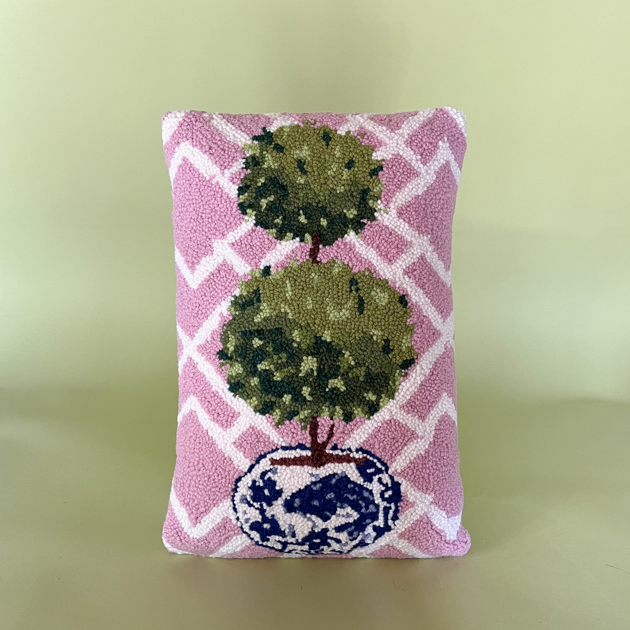 Celebrate in style with this hooked-wool topiary pillow that will certainly make you think pink! Features a hidden zipper.
