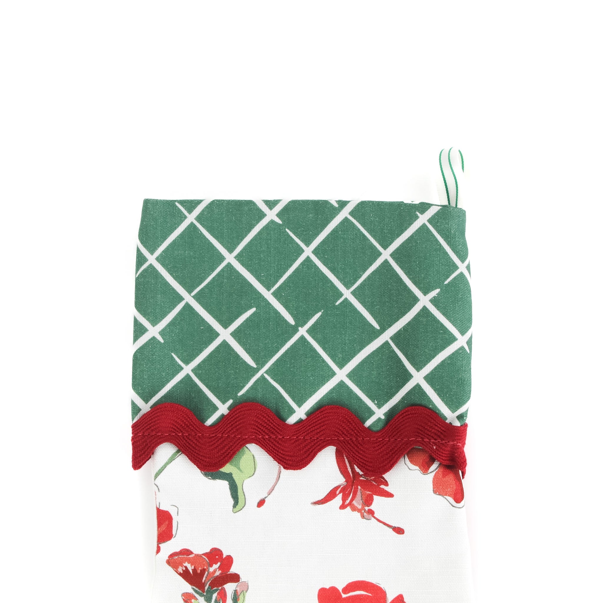 Punctuated with stunning red ric rac trim, this timeless, made-in-America stocking mixes two stunning Madcap Cottage fabric patterns--Cottage Grove and Bahama Court--to create a wonderful, heirloom-worthy Christmas treasure. The mix of the patterns is electric, crackling. Your fireplace mantel never looked so good. Or so chic!