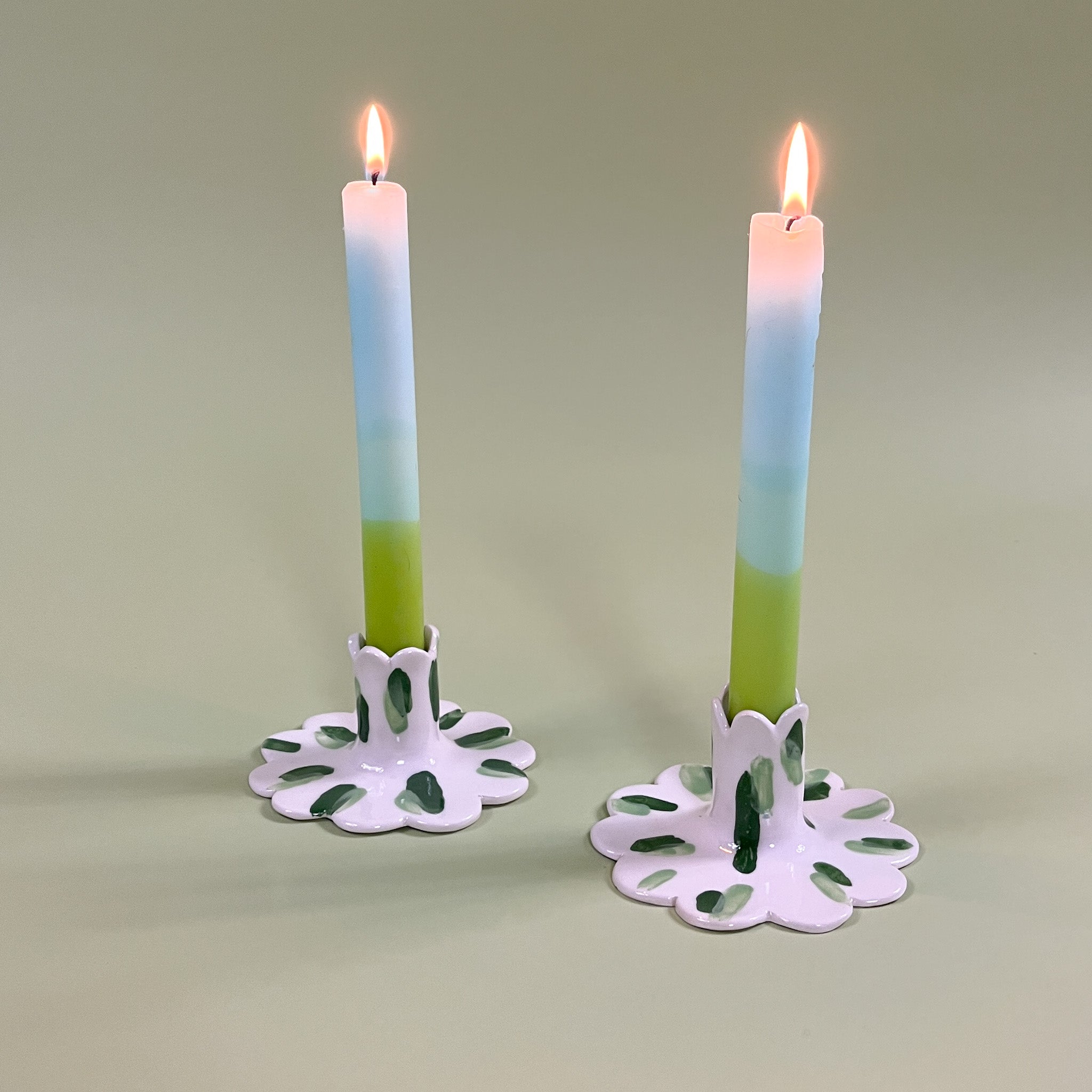 Crafted by hand in Spain, these Club House patterned ceramic candle holders in green are the epitome of simple chic kicked-up with a scalloped flourish. These candleholders are the perfect base for our Made in the UK highly colored taper candles. The perfect host/hostess gift.