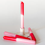 Imported from England, these magical, dark pink/light pink/white color-blocked hand-dipped taper candles will add glamour to your holiday tabletop. Plus, they pair beautifully with our hand-made ceramic scallop-edge candle holders from Spain. Get lit in style. Made from unscented paraffin wax. Three candles per boxed set, in alternating colors. Please note: Because each candle is made by hand, there may be slight variation in color patterning.